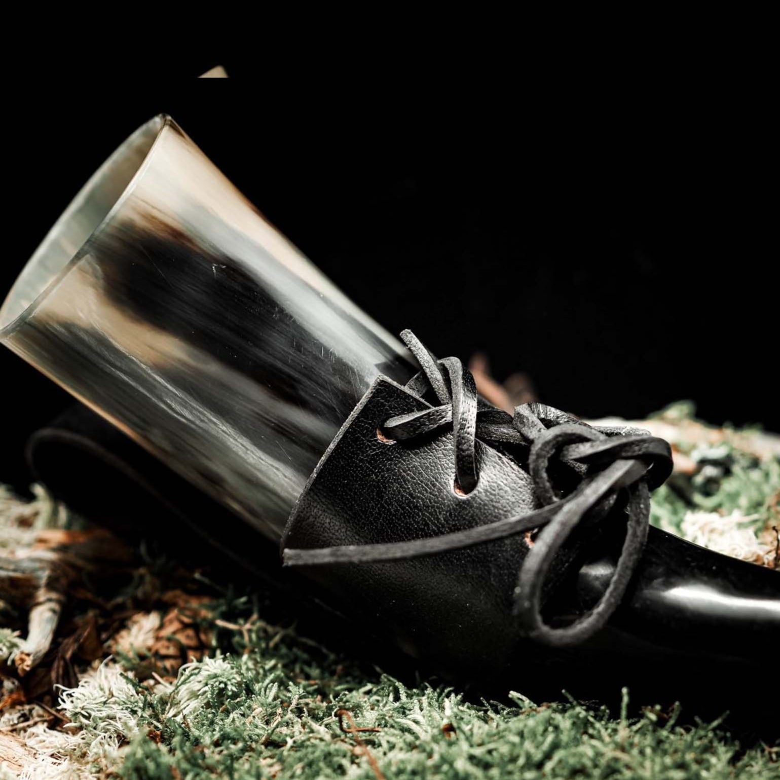 Detta är en praktisk och snygg hornhållare till t.ex. bältet. Hållaren är gjord i tjockt och hållbart läder. Snörningen gör den väldigt anpassningsbar och kan ställas efter storlek och form på ditt horn. Denna modell passar för de flesta mindre horn, 100-400 ml. 60 till 80 millimeter i diameter. Mät ca 5 till 8 cm nedanför hornets kant.