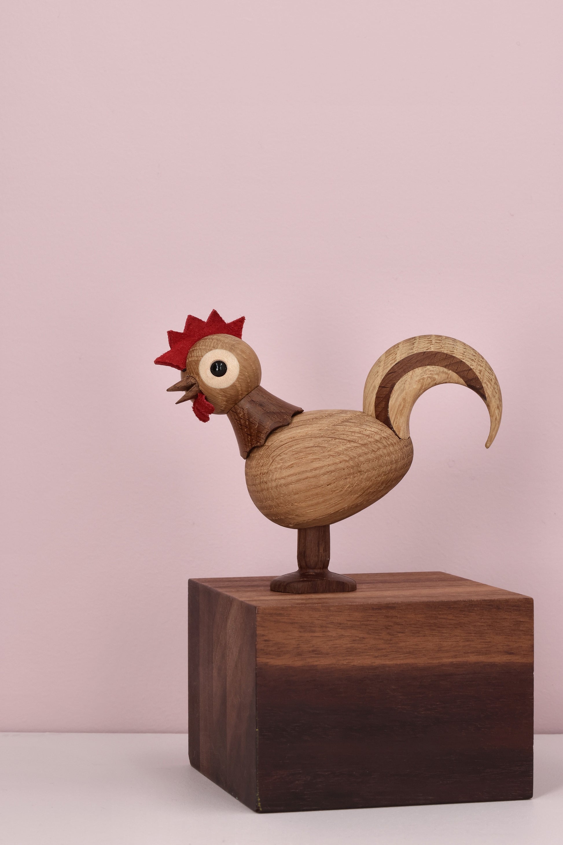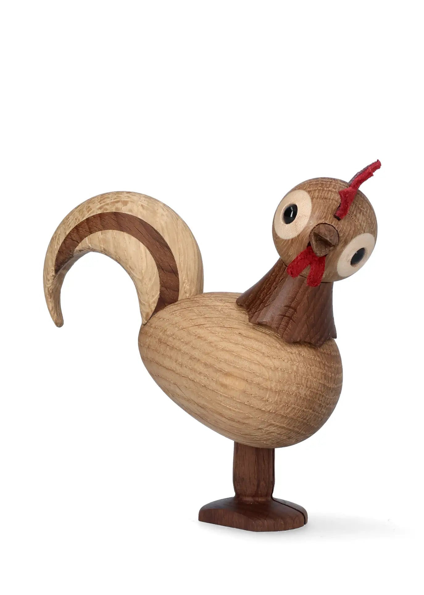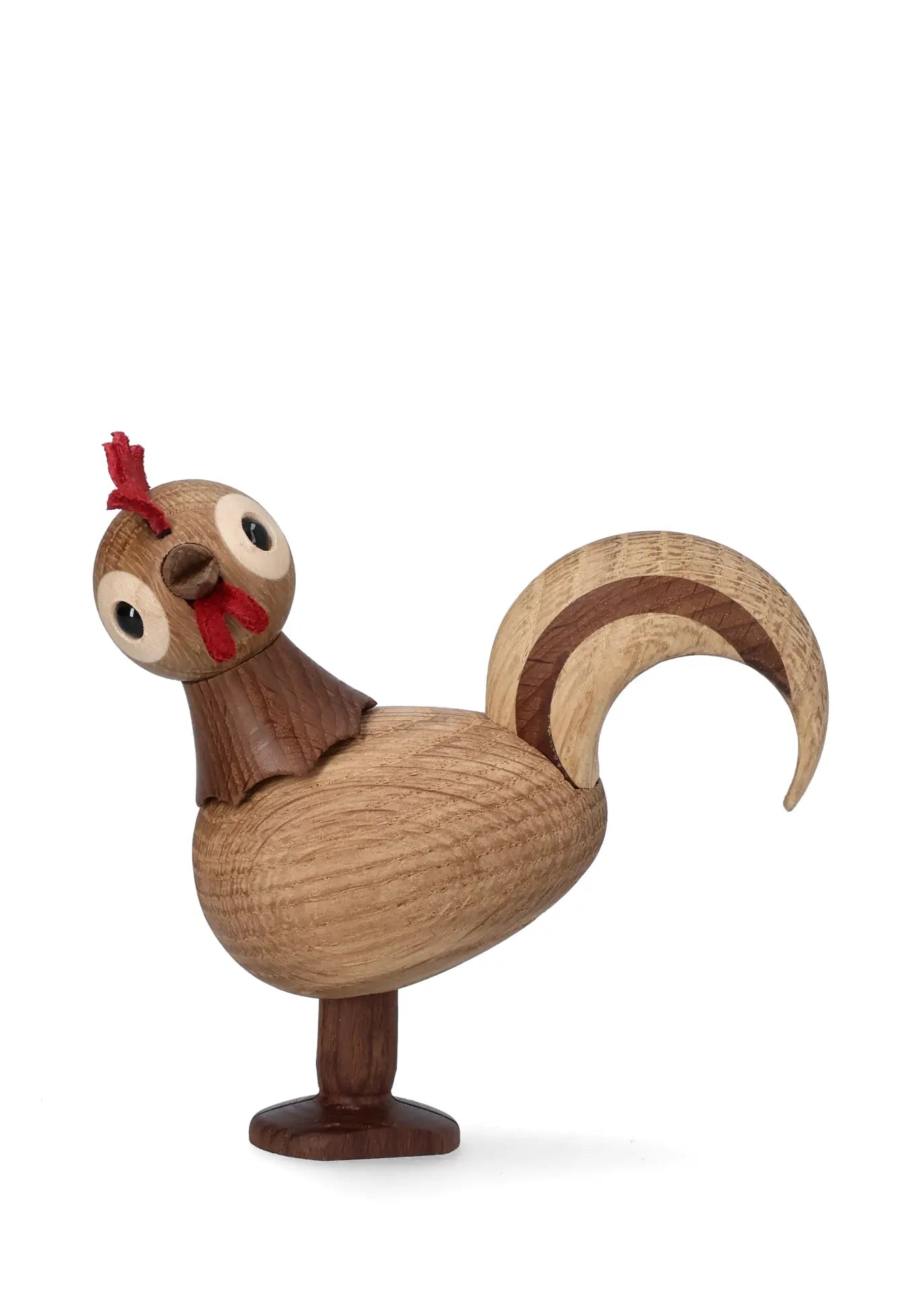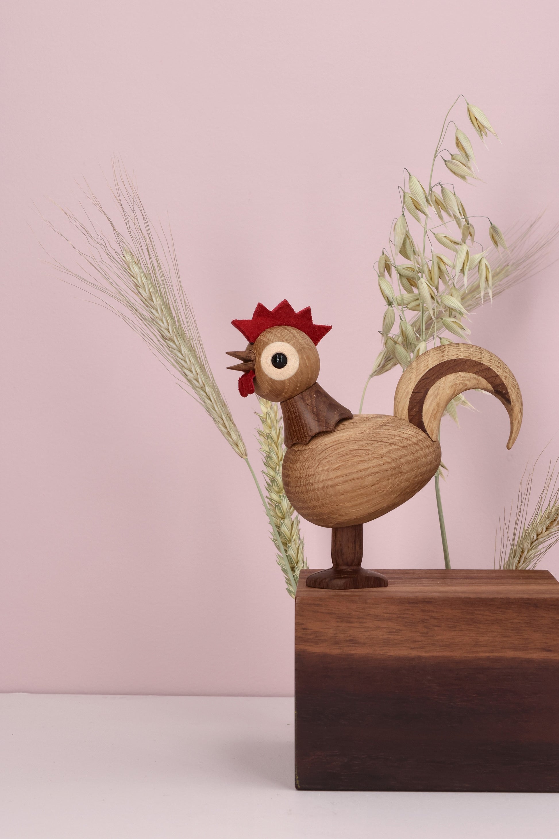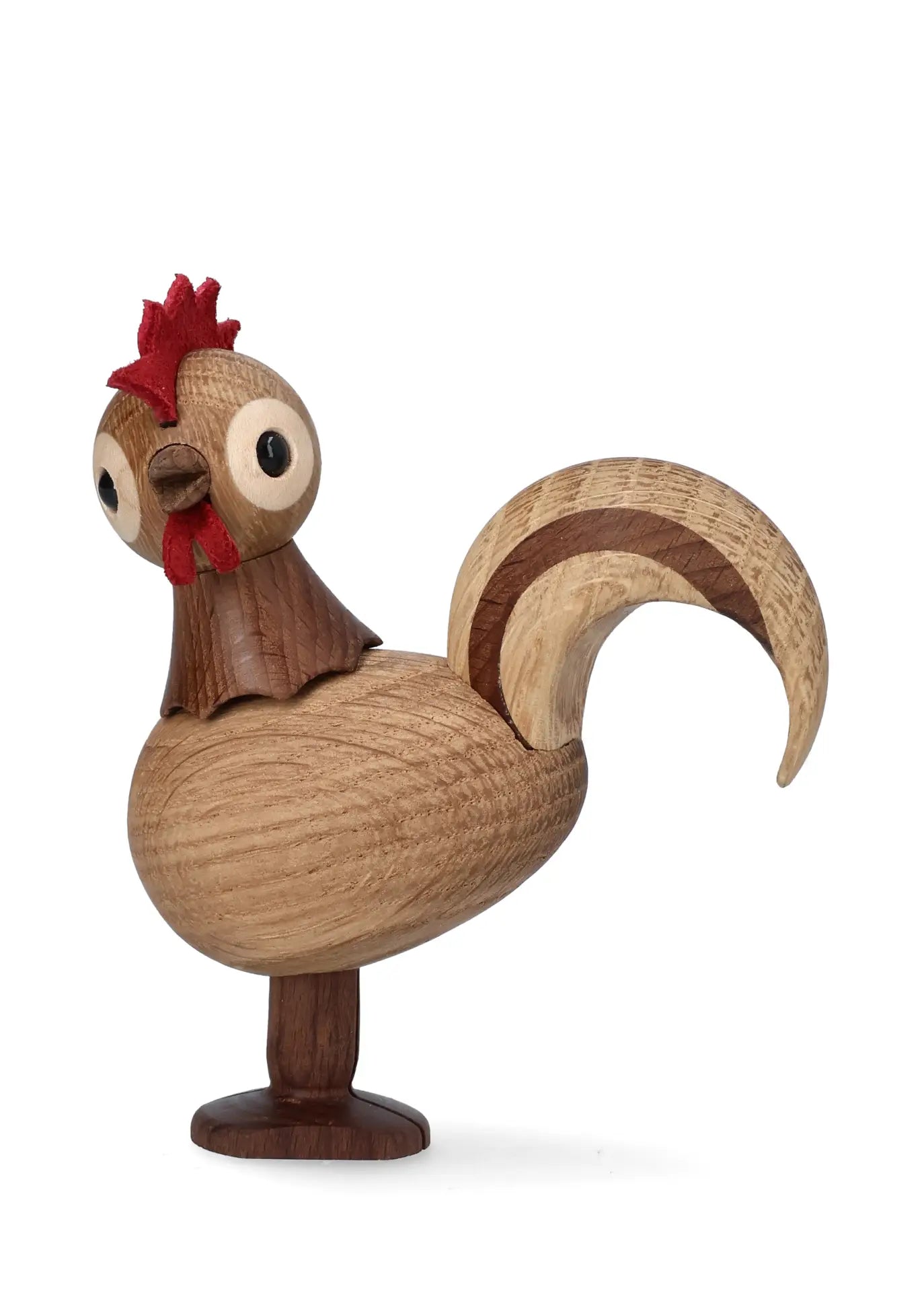 Rise från Spring Copenhagen är en färgstark trätupp som sprider energi och personlighet i hemmet. Med sin uppblåsta bröstkorg, distinkta kam och stolta hållning står han stadigt – som om han just hälsar morgonen välkommen.