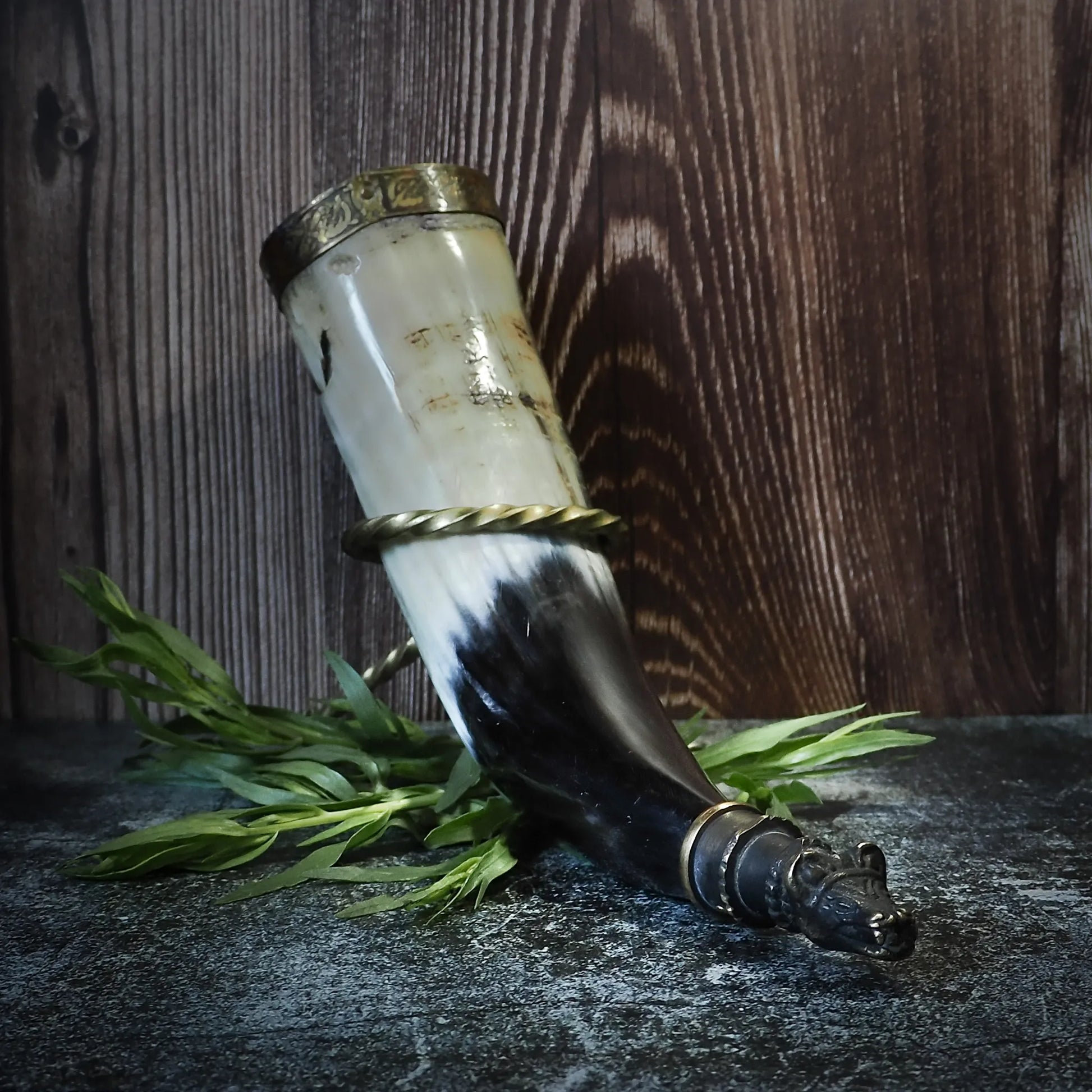 Ett vackert dryckeshorn, utsmyckat med mässingsdetaljer. Passar lika bra på festen som i bokhyllan. Tänk på att horn är ett naturligt material och att alla horn är unika vad gäller form och färg. Alla våra dryckeshorn är lackade invändigt.