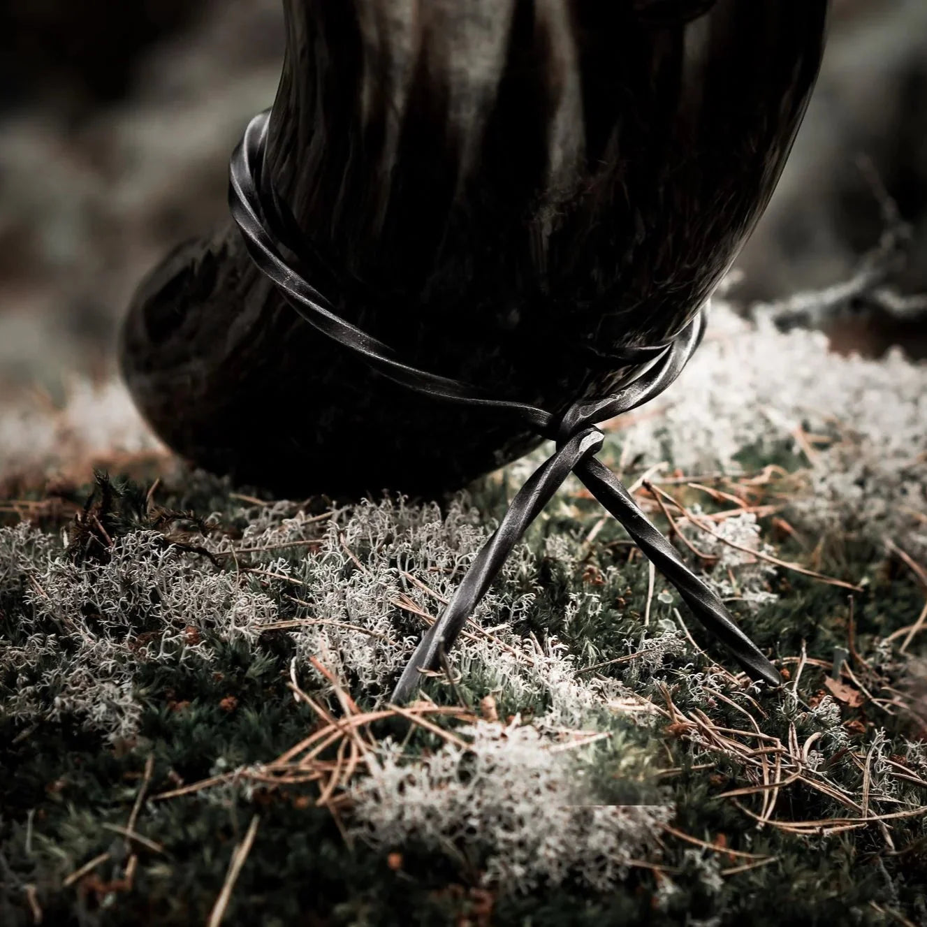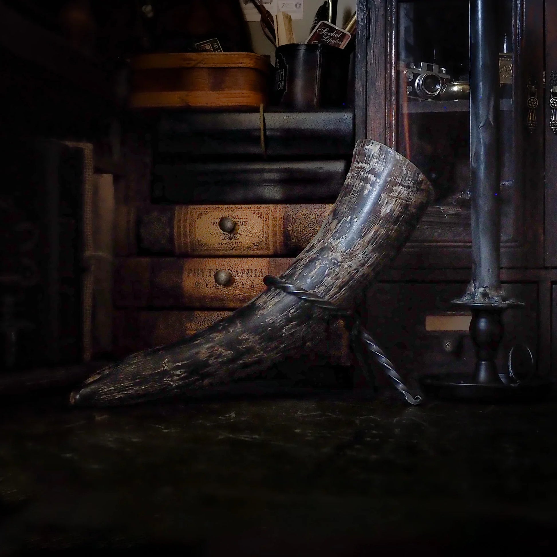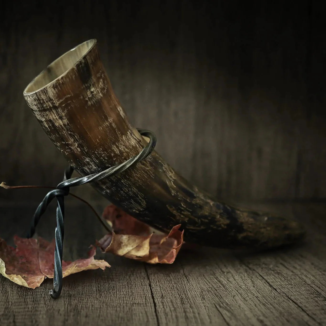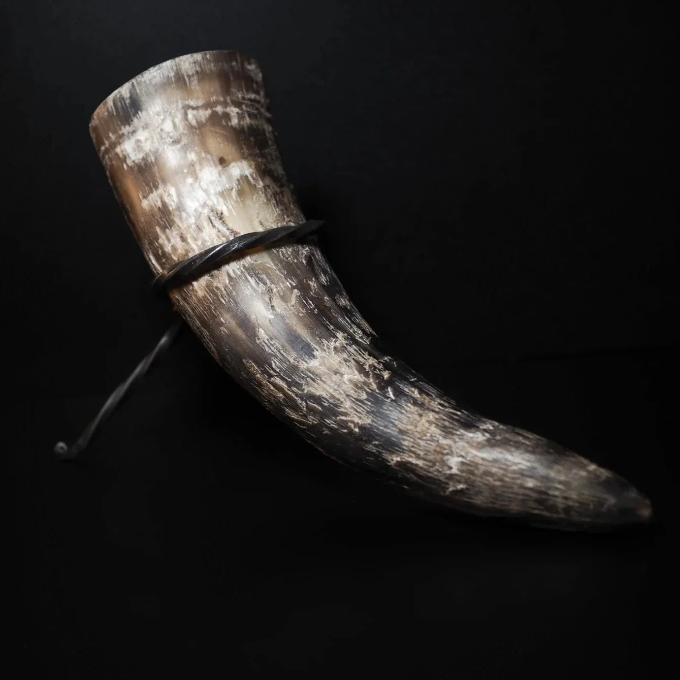Här får du ett set med ett snyggt horn som passar i storleken till en liten öl. Hornet levereras med ett handsmidet hornställ, som gör att du även kan ställa hornet som en häftig prydnad i bokhyllan.