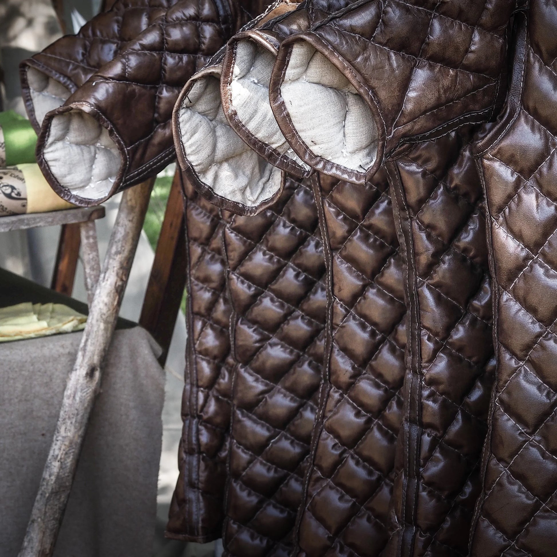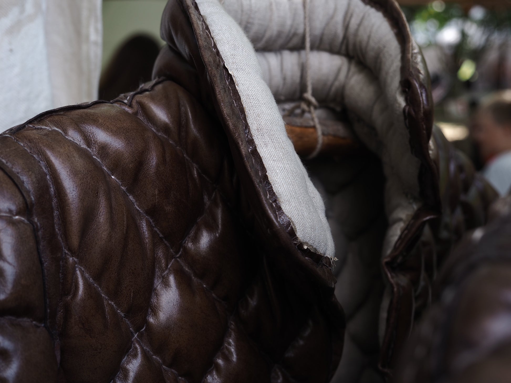 Jackan är sytt i läder, fodrat med linne. Paddingen är gjord av återvunnet linnefiber. Storlekarna är lite små.