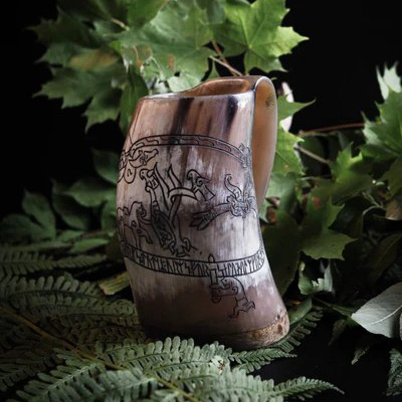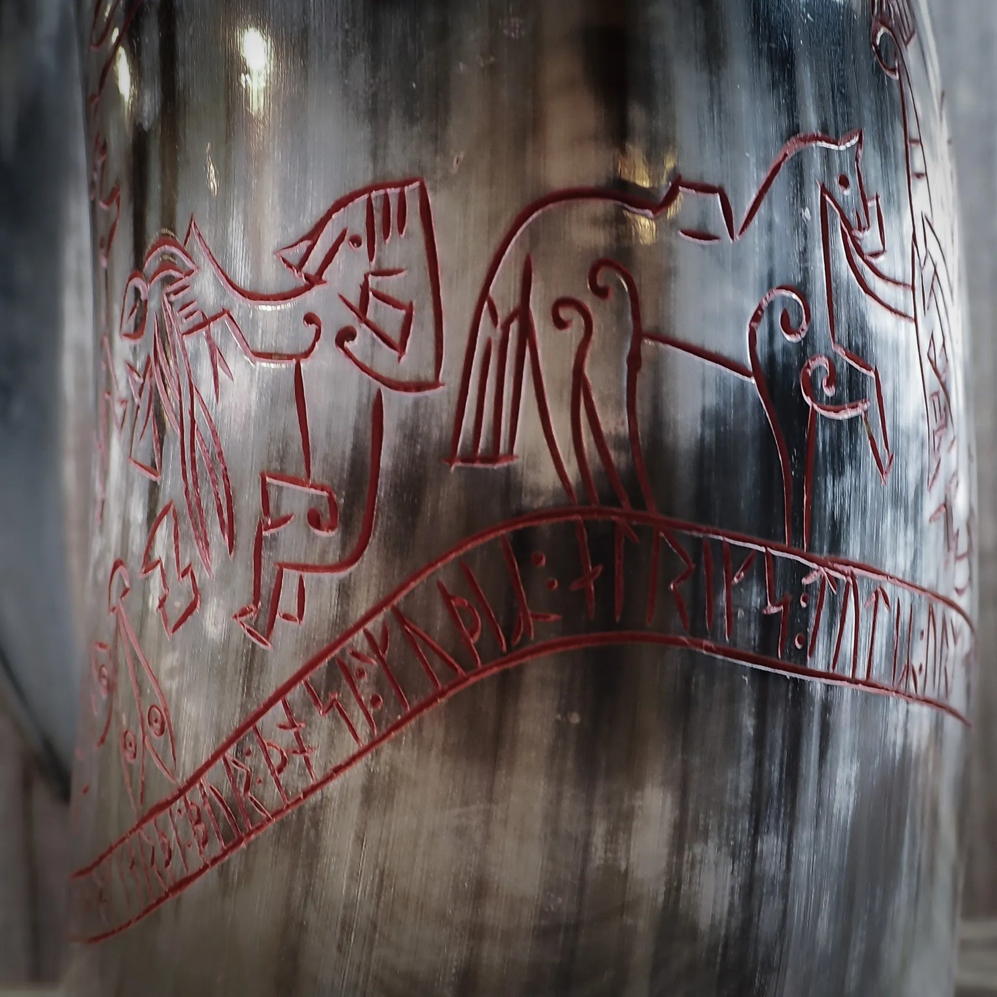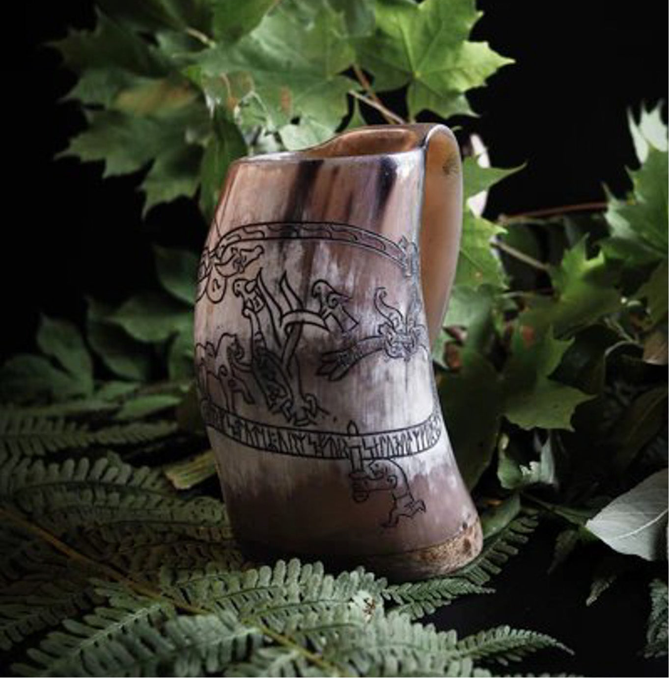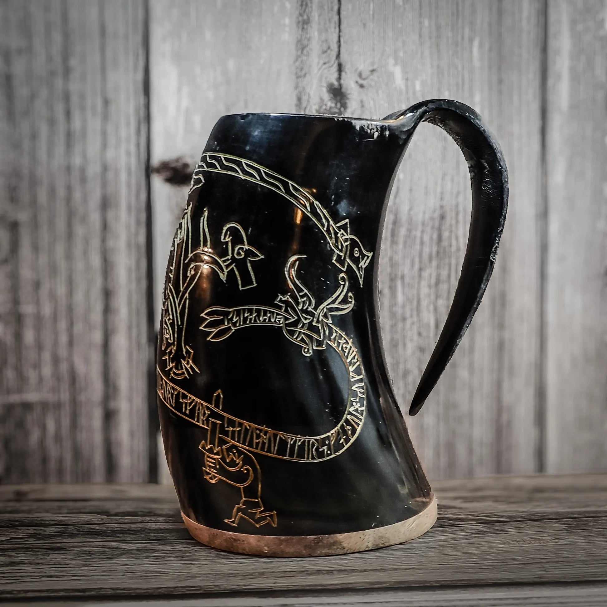 Ett äkta hedniskt ölkrus med en kopia av Sigurdsagans runsten graverad på sig. En snygg mugg som givetvis är gjord för att användas, men som också är otroligt snygg i bokhyllan. Skåla ordentligt på vikingavis, i goda vänners lag. Det praktiska handtaget gör också kruset lätt att hänga i bältet.