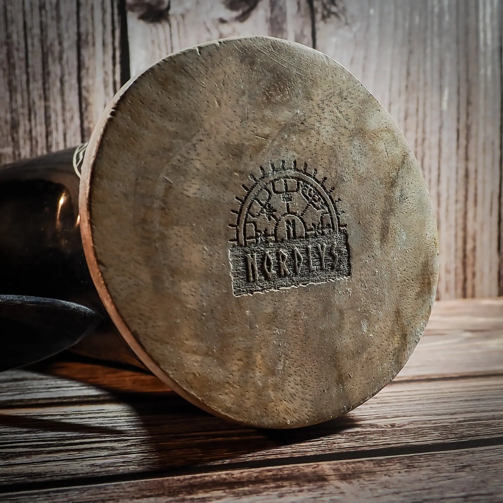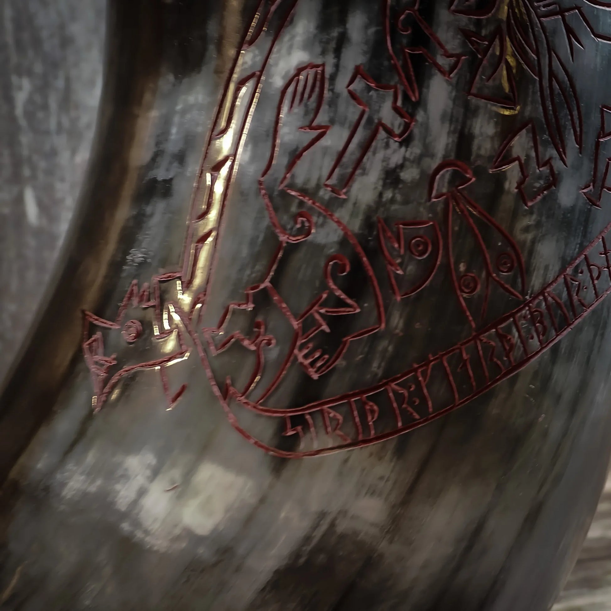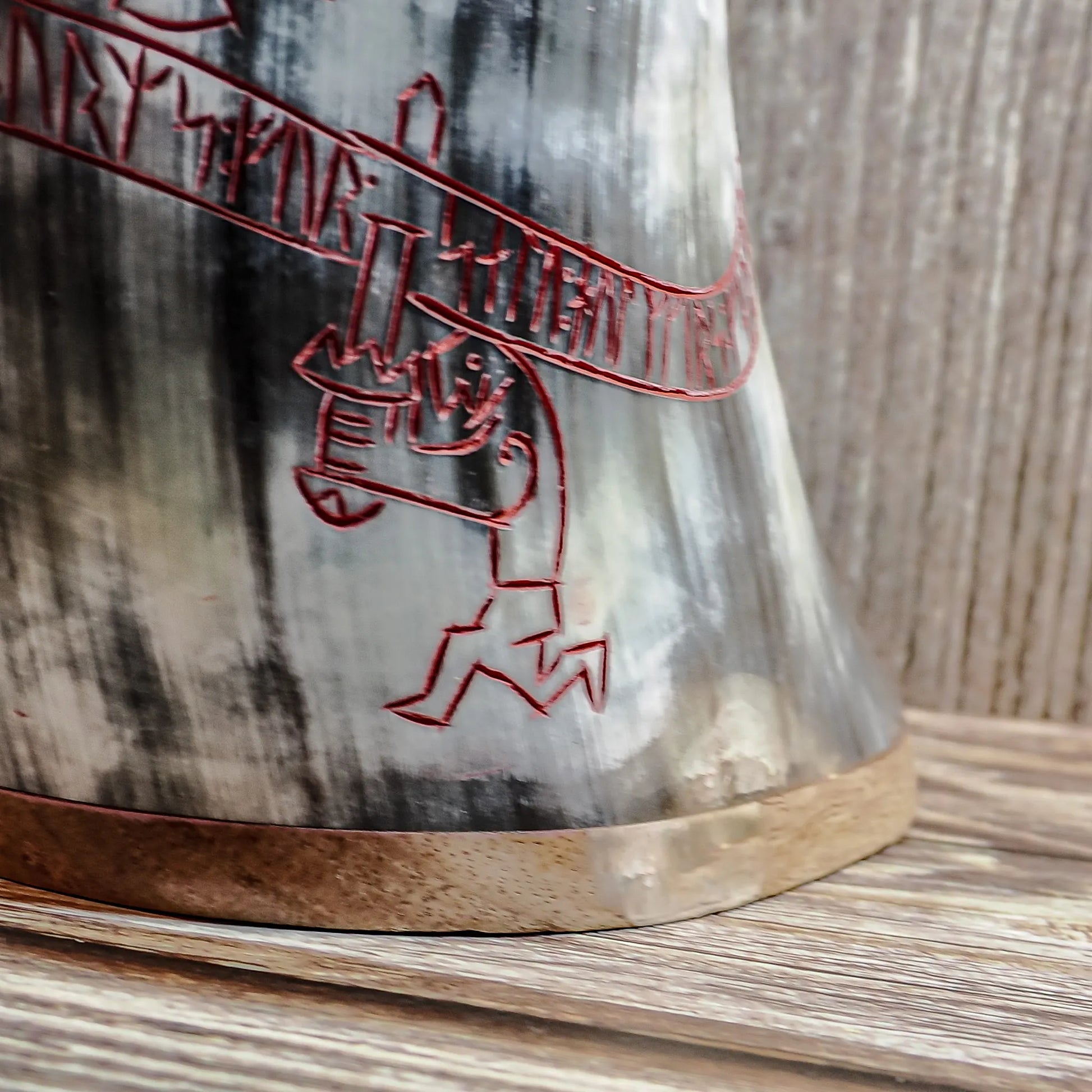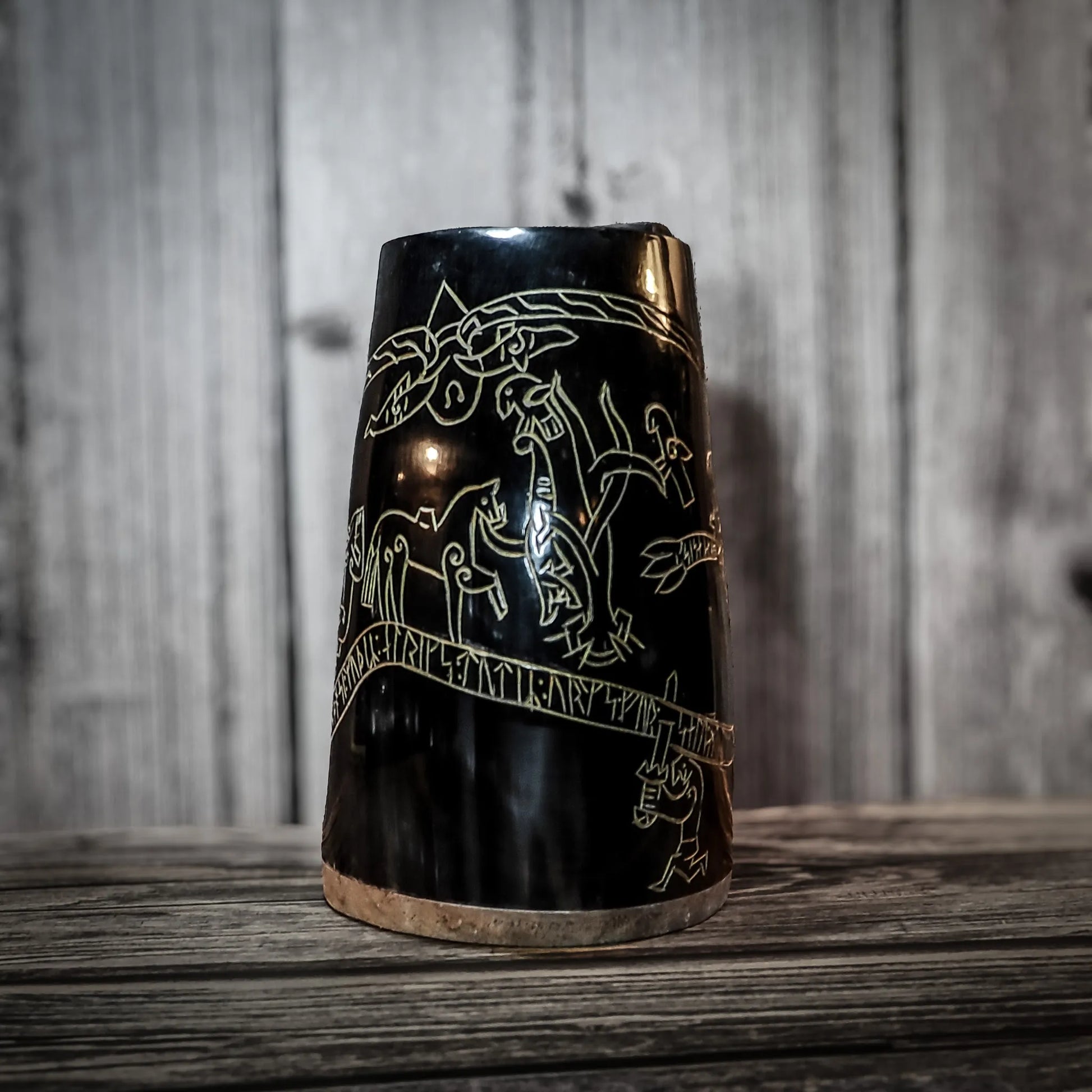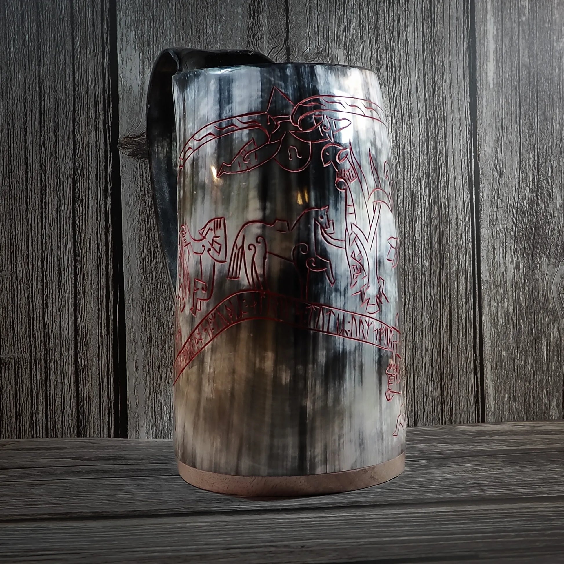 Ett äkta hedniskt ölkrus med en kopia av Sigurdsagans runsten graverad på sig. En snygg mugg som givetvis är gjord för att användas, men som också är otroligt snygg i bokhyllan. Skåla ordentligt på vikingavis, i goda vänners lag. Det praktiska handtaget gör också kruset lätt att hänga i bältet.