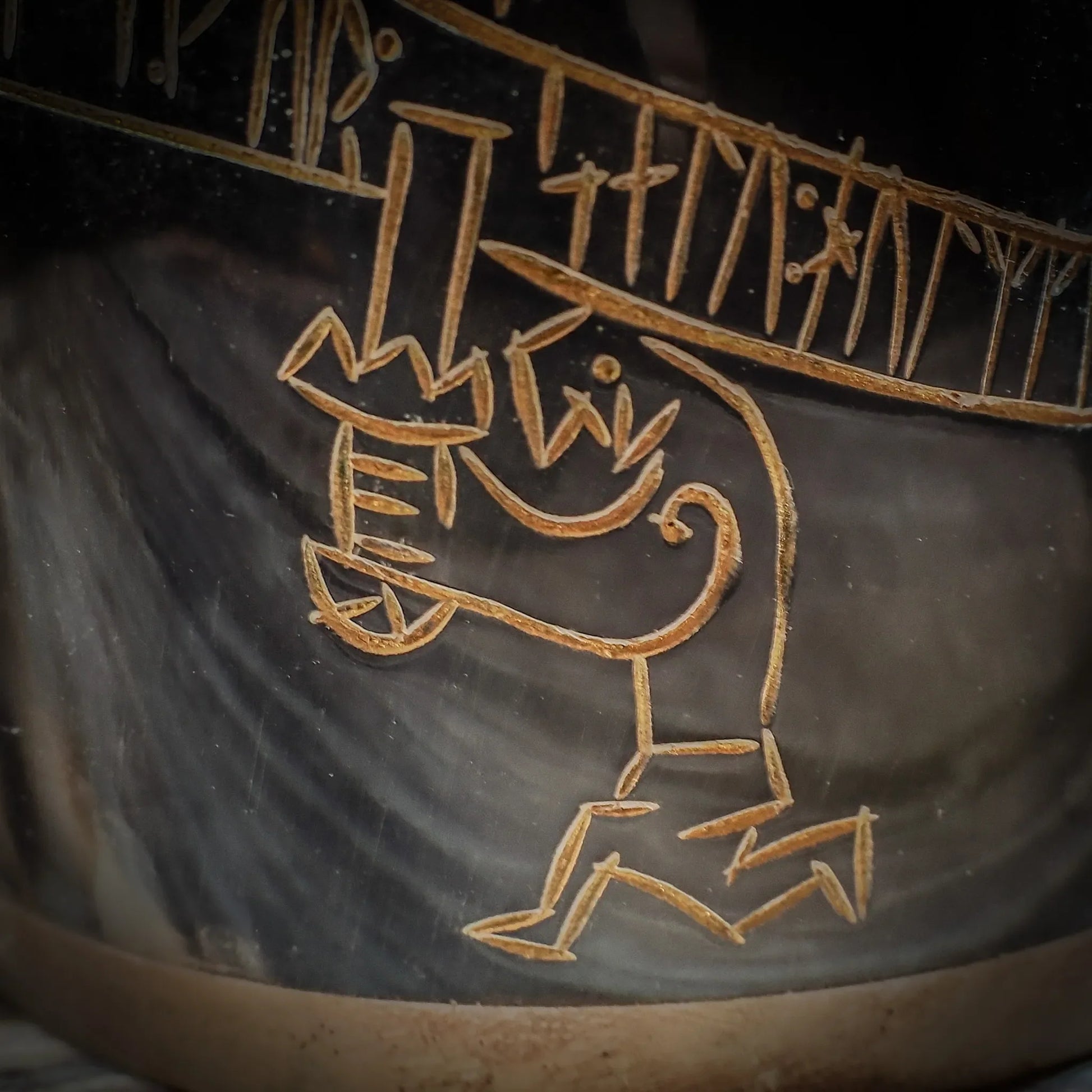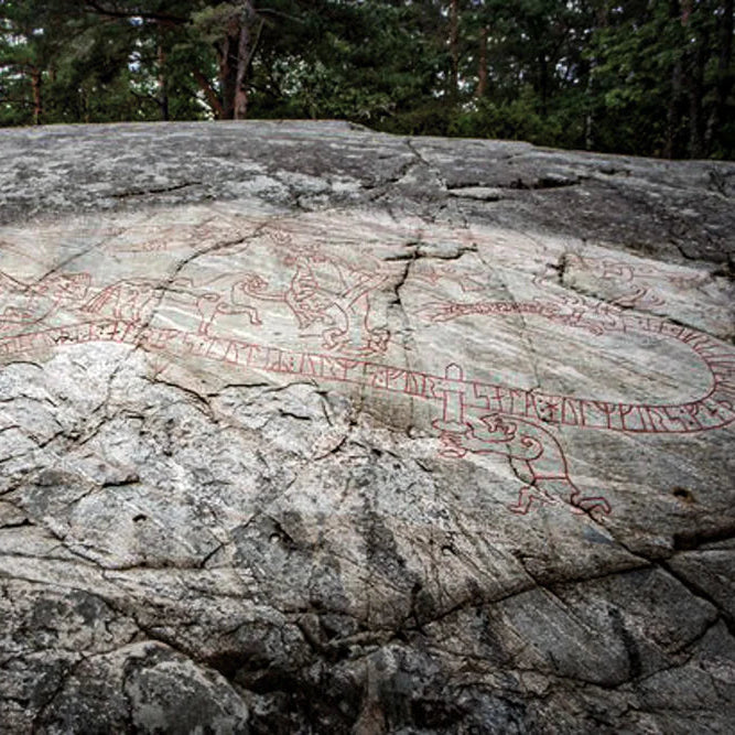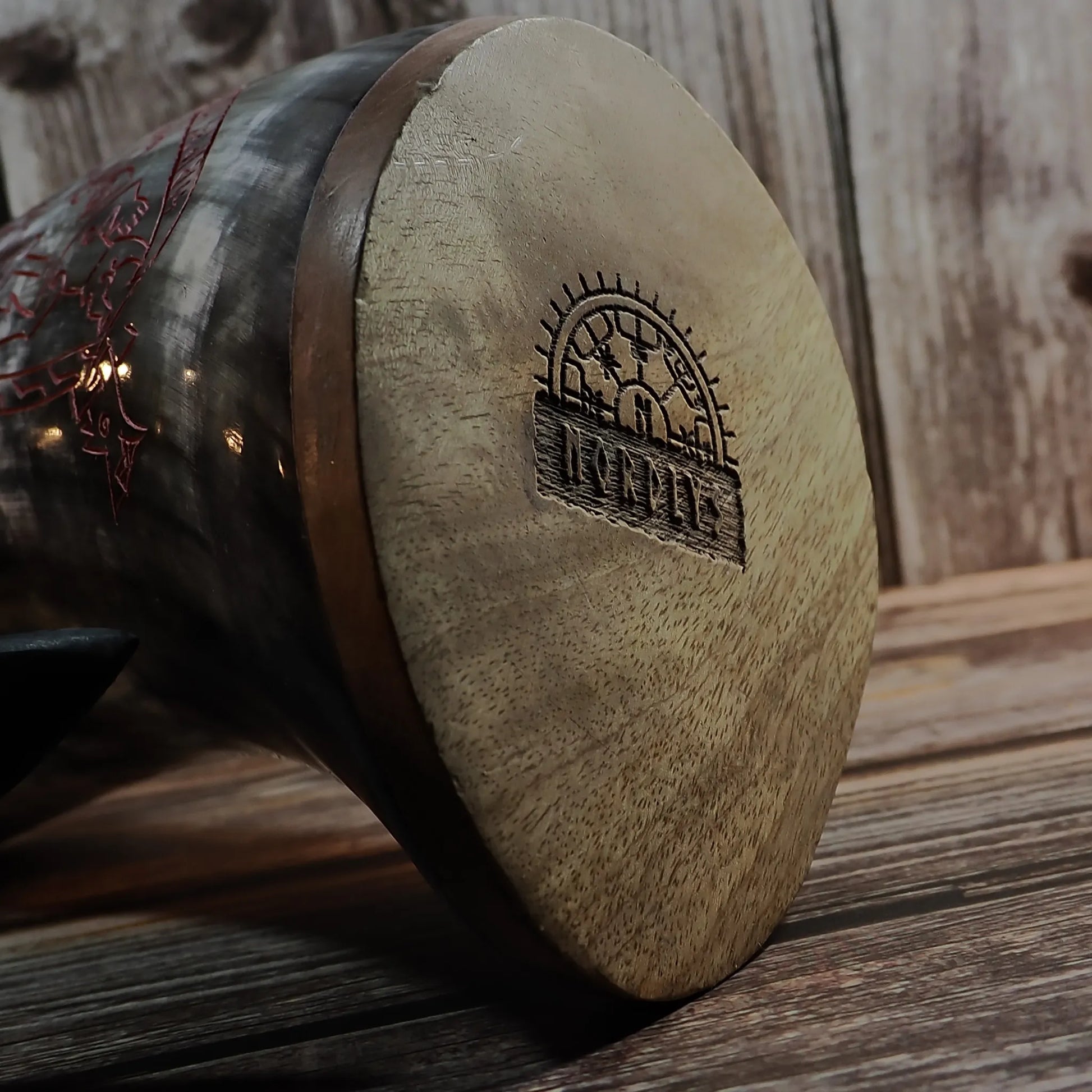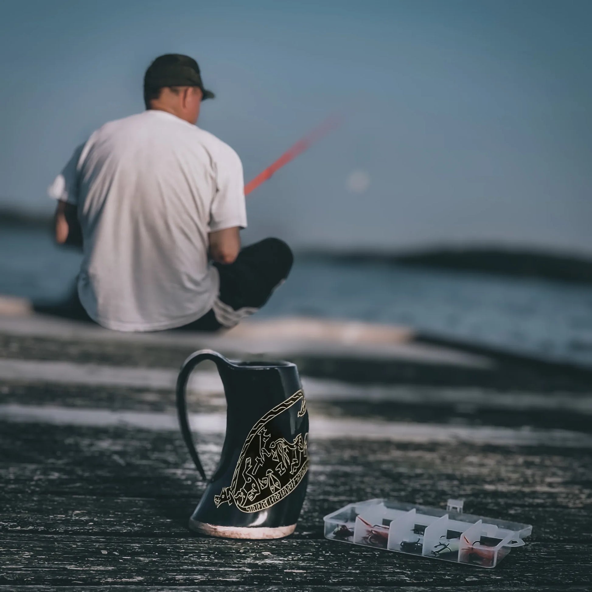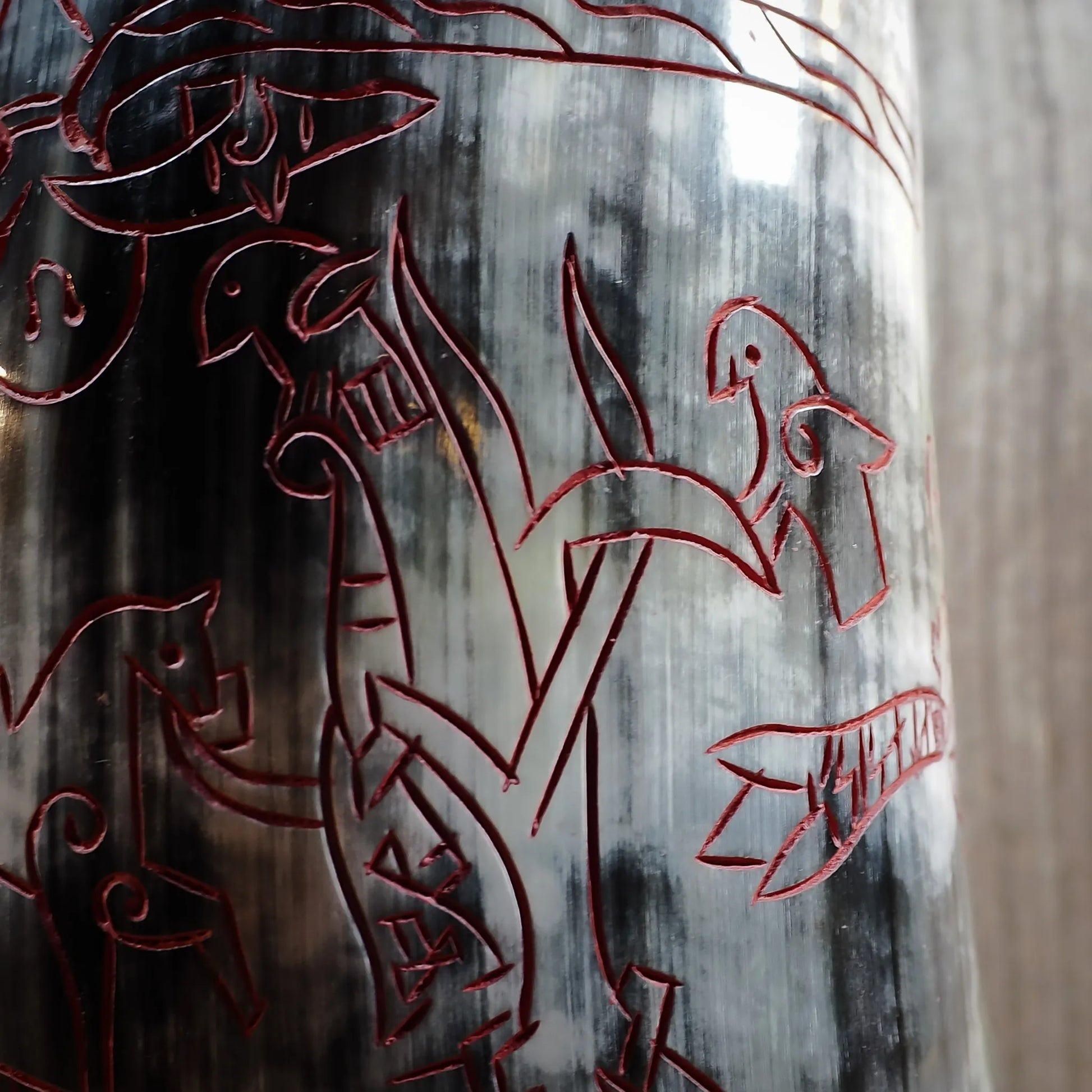 Ett äkta hedniskt ölkrus med en kopia av Sigurdsagans runsten graverad på sig. En snygg mugg som givetvis är gjord för att användas, men som också är otroligt snygg i bokhyllan. Skåla ordentligt på vikingavis, i goda vänners lag. Det praktiska handtaget gör också kruset lätt att hänga i bältet.