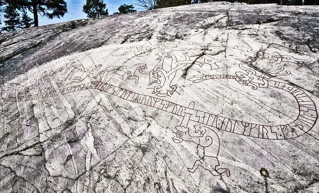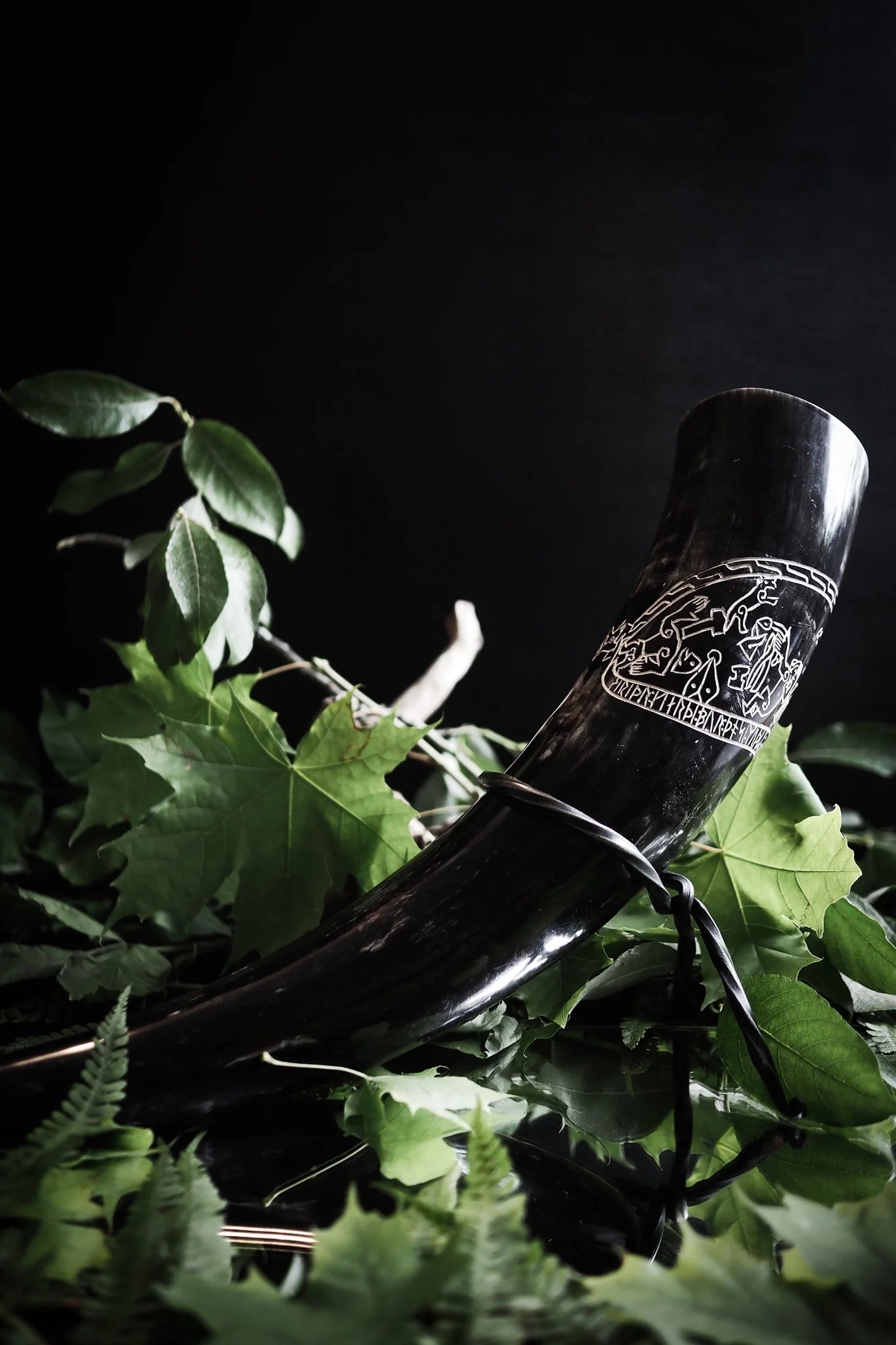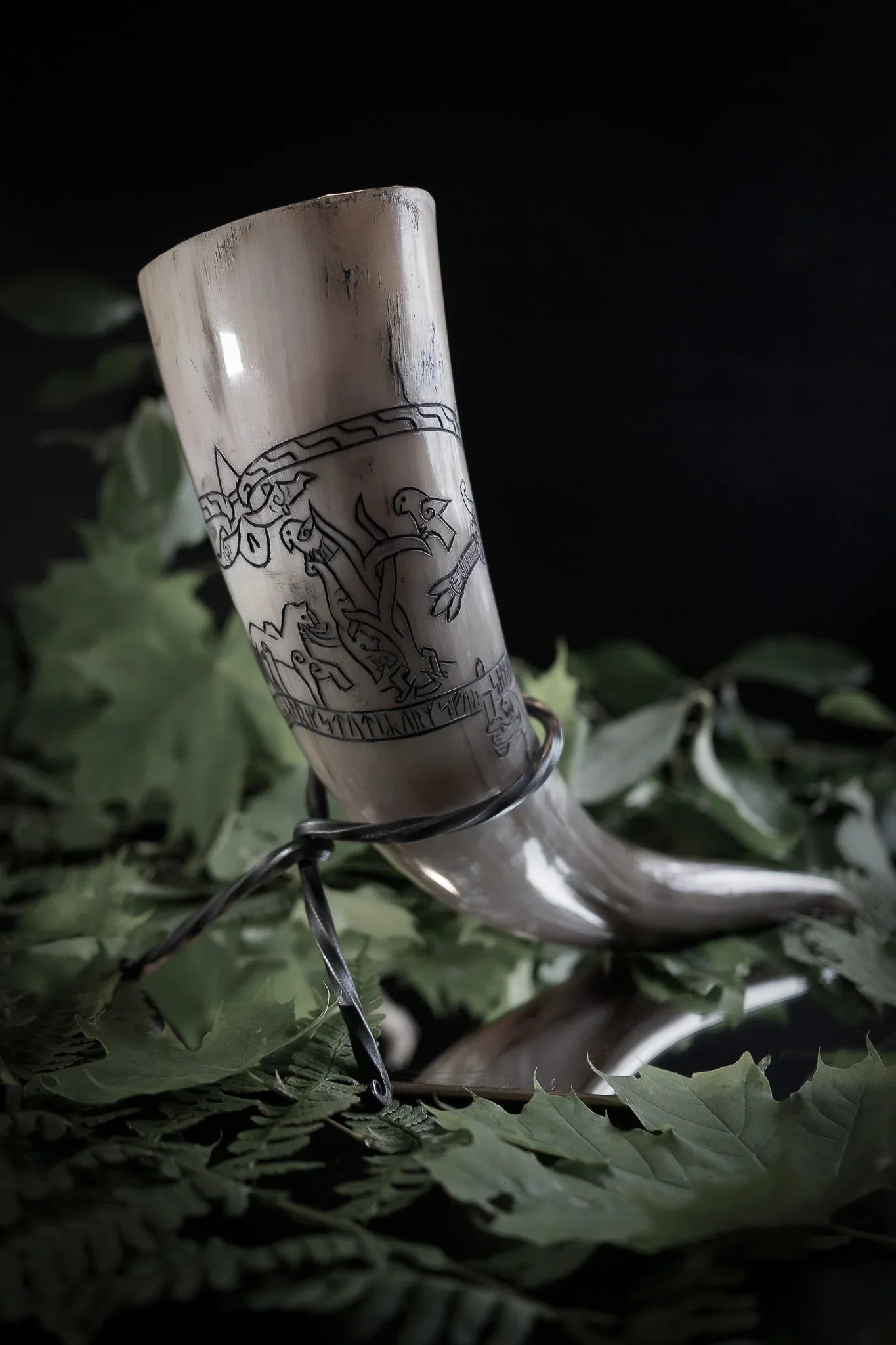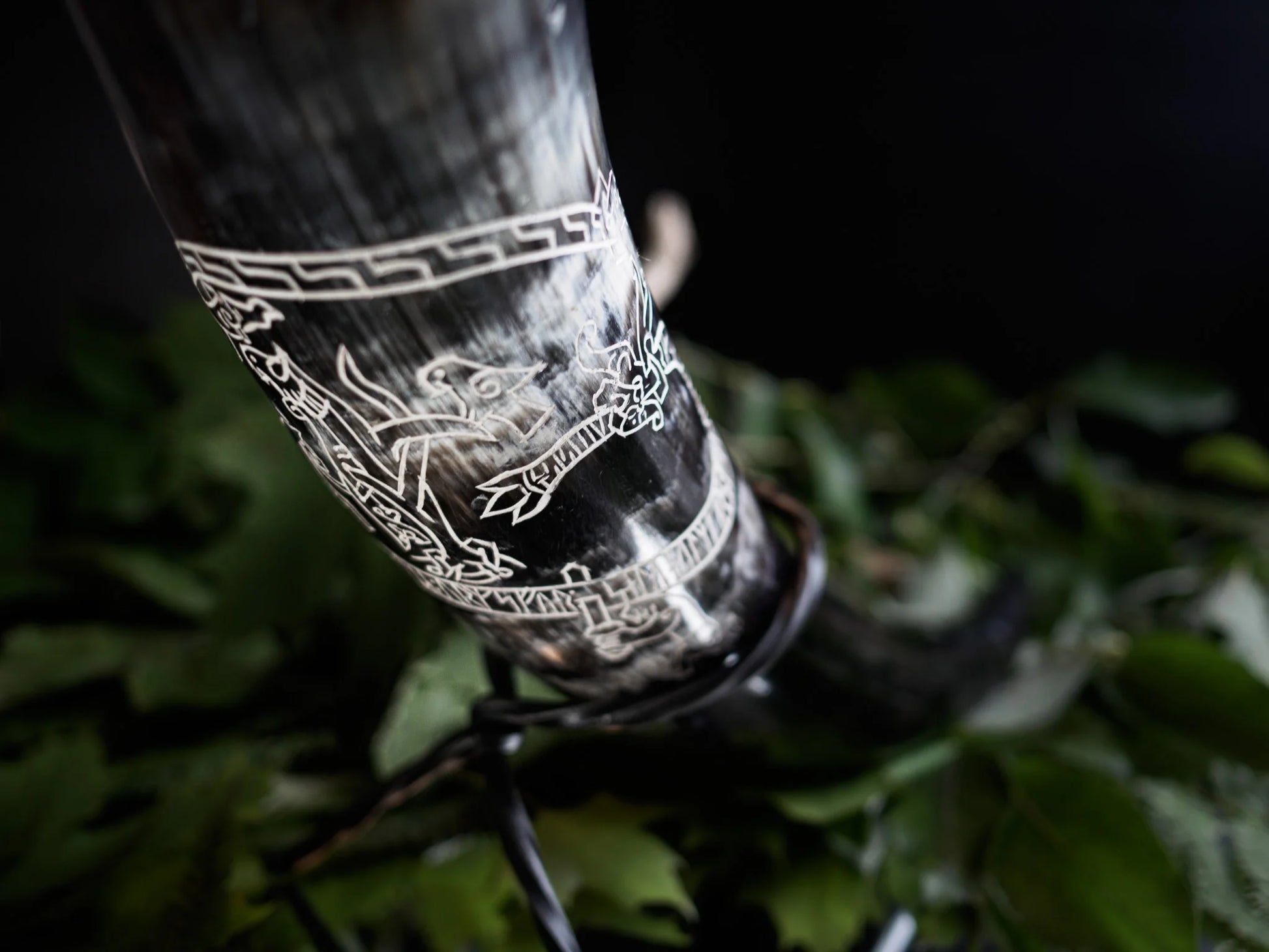 Ett vackert naturligt kohorn med en gravyr av den mytologiska sagan om Sigurd fafnirsbane. Mönstret är hämtat från en runsten utanför Eskilstuna i Sverige, där hela sagan nedtecknats med tillhörande grafiska beskrivningar.
