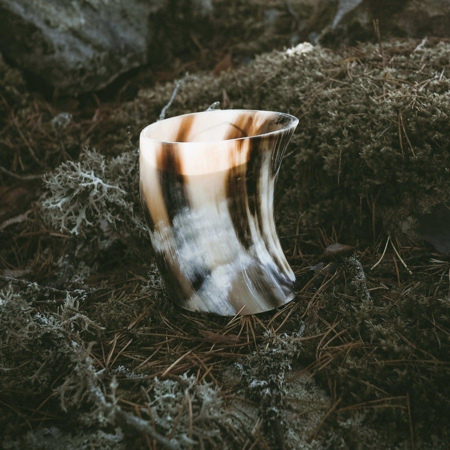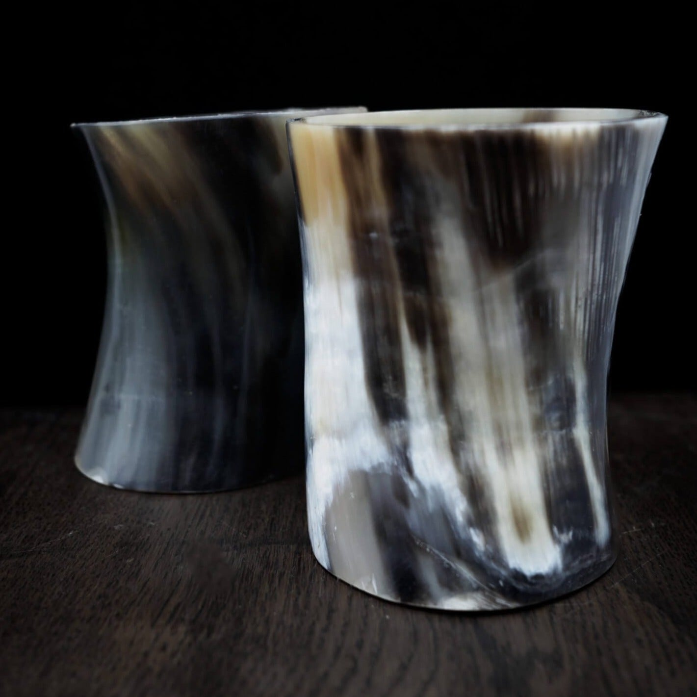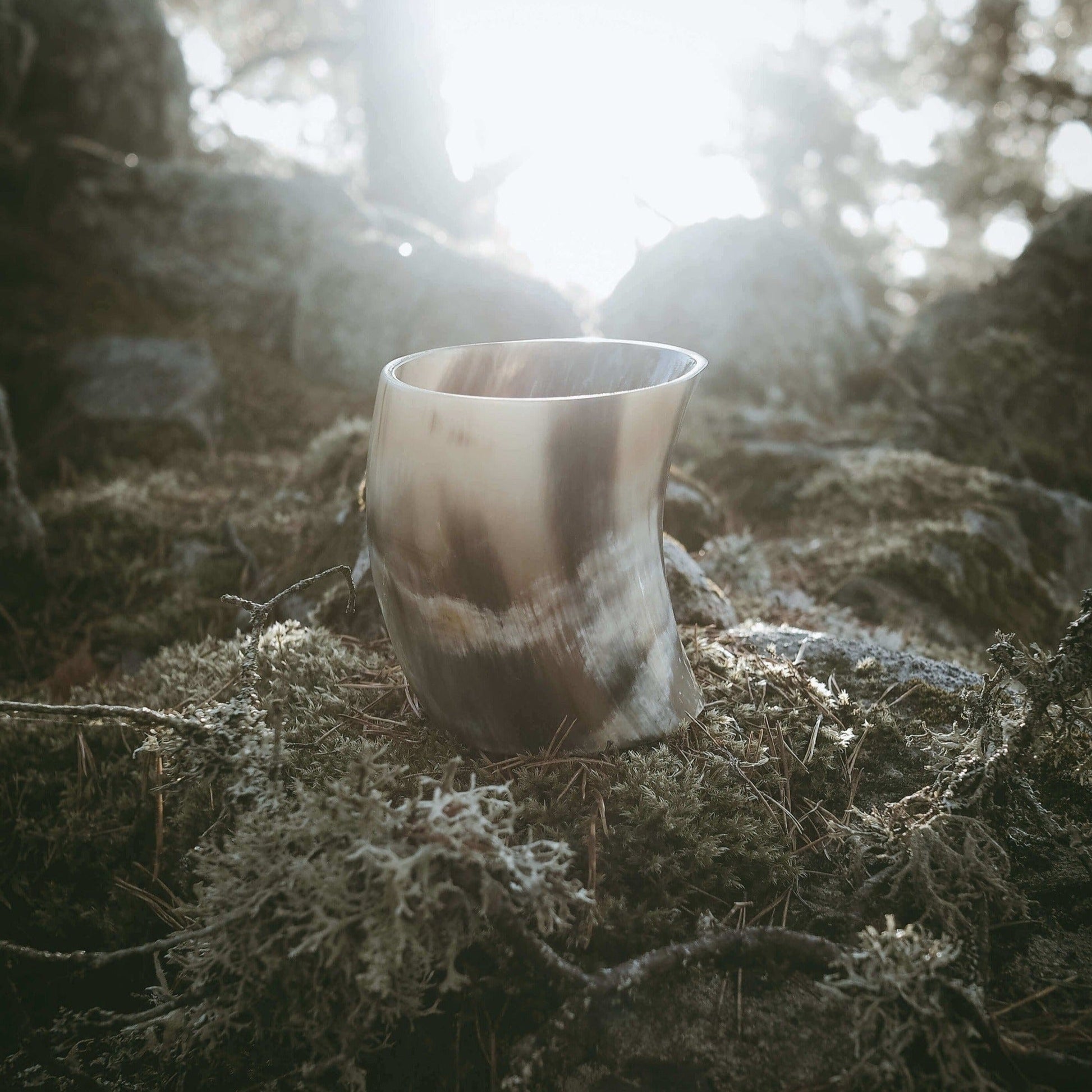 Stort grogglas i Kohorn. Ett större glas för den törstige. Storlekarna varierar något men ligger mellan 3 och 4 dl.Infälld botten i trä. Lackad och förseglad invändigt. Polerad utsida.