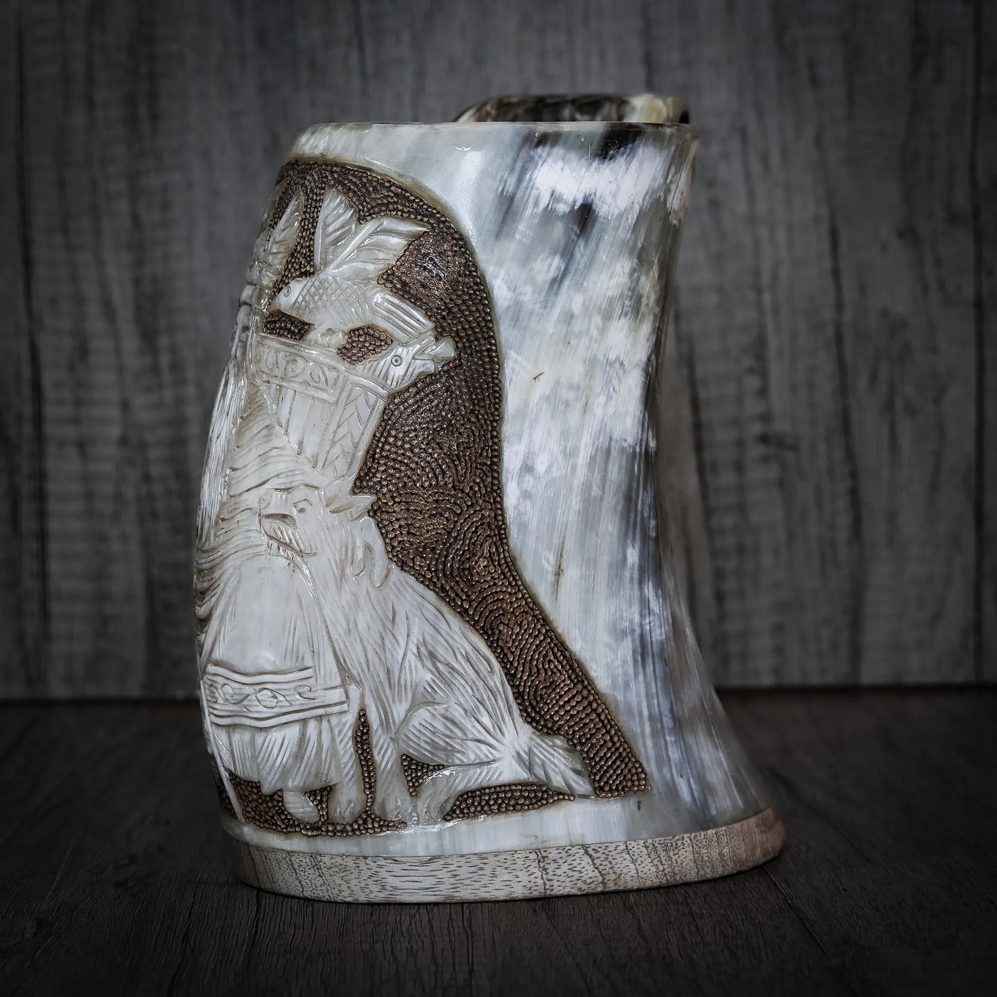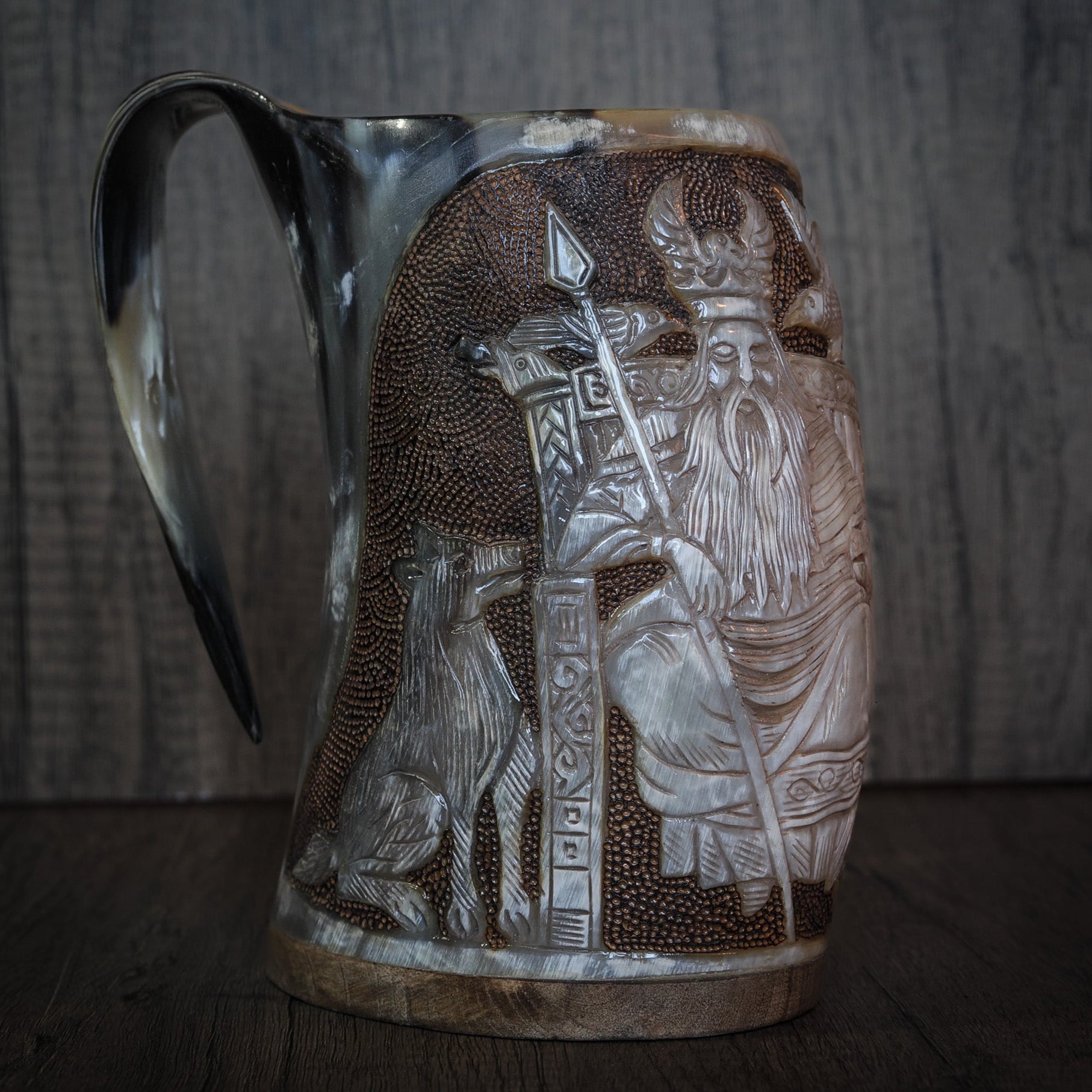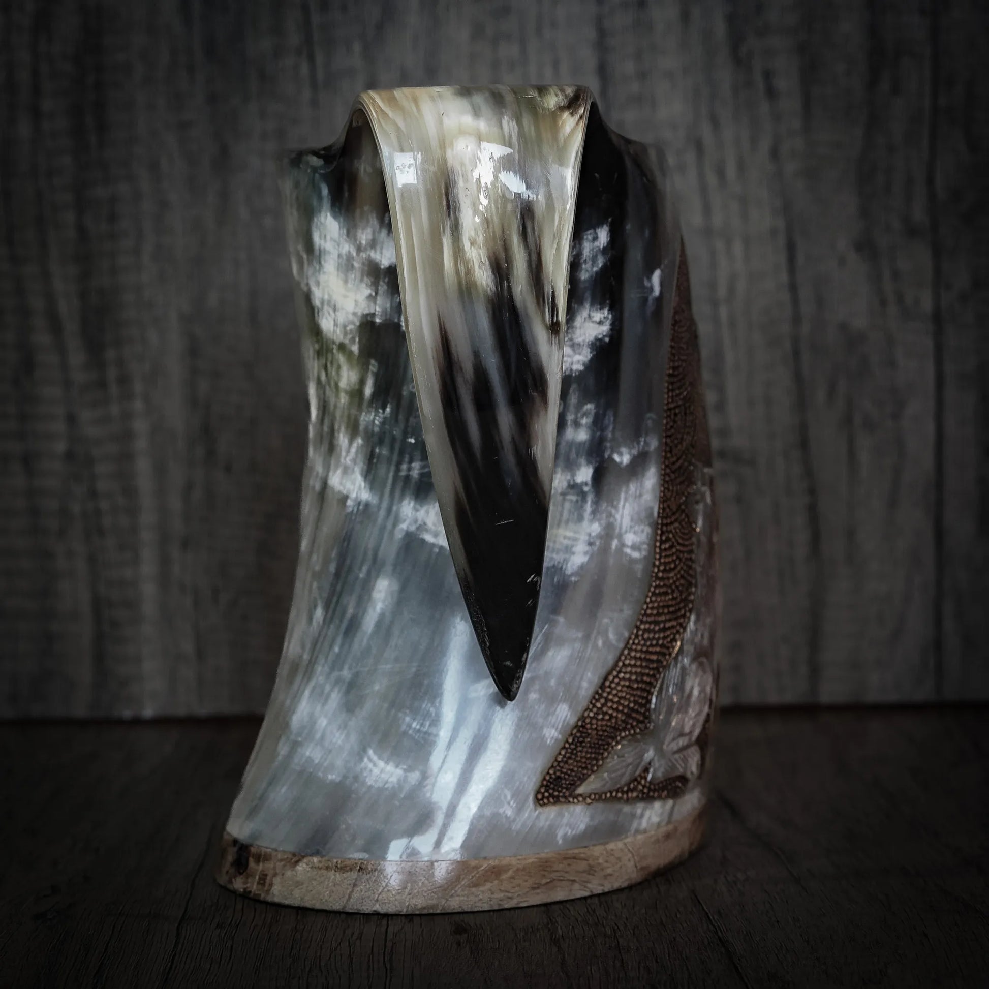 Imponera på vem som helst med detta unika handsnidade hornkrus. För att kunna tillverka dessa enastående konstverk, har våra hantverkare först letat igenom hundratals horn i sin jakt på ett horn som är tjockt nog. För att vara så tjocka i godset som 10mm måste hornen komma från riktiga monster till tjurar. När det rätta hornet hittats, påbörjas den många timmar långa processen med att skära, slipa och polera. Varje horns unika färg och form, i kombination med hantverkarens skicklighet och motivets kraft, skapar ett unikt mästerverk av en kvalitet som sällan ses idag.