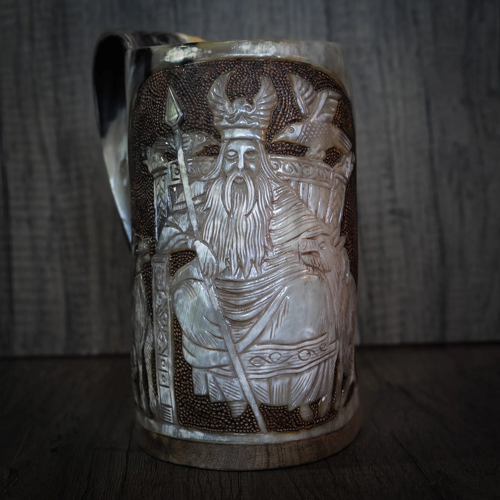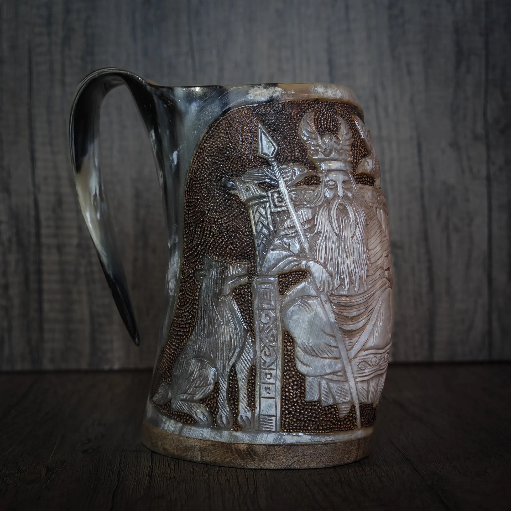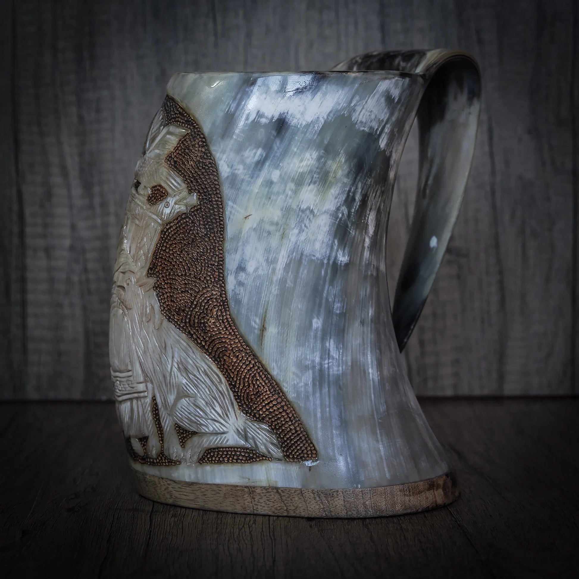 Imponera på vem som helst med detta unika handsnidade hornkrus. För att kunna tillverka dessa enastående konstverk, har våra hantverkare först letat igenom hundratals horn i sin jakt på ett horn som är tjockt nog. För att vara så tjocka i godset som 10mm måste hornen komma från riktiga monster till tjurar. När det rätta hornet hittats, påbörjas den många timmar långa processen med att skära, slipa och polera. Varje horns unika färg och form, i kombination med hantverkarens skicklighet och motivets kraft, skapar ett unikt mästerverk av en kvalitet som sällan ses idag.