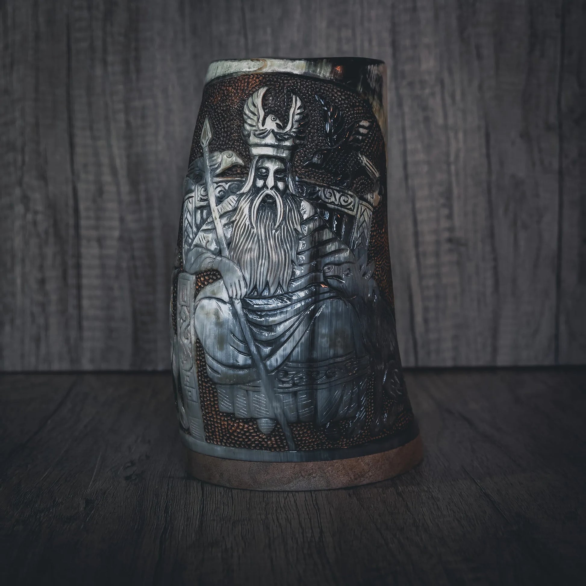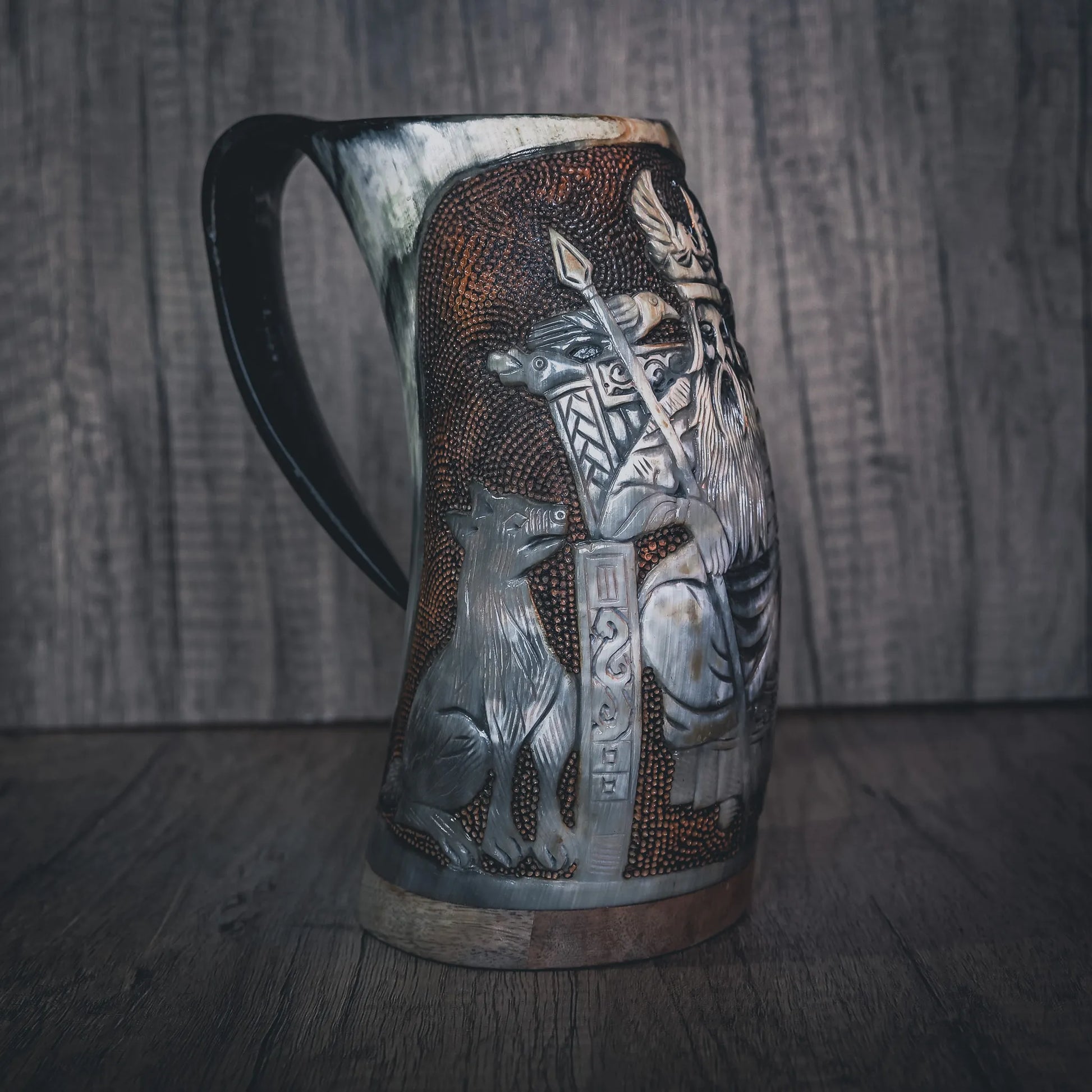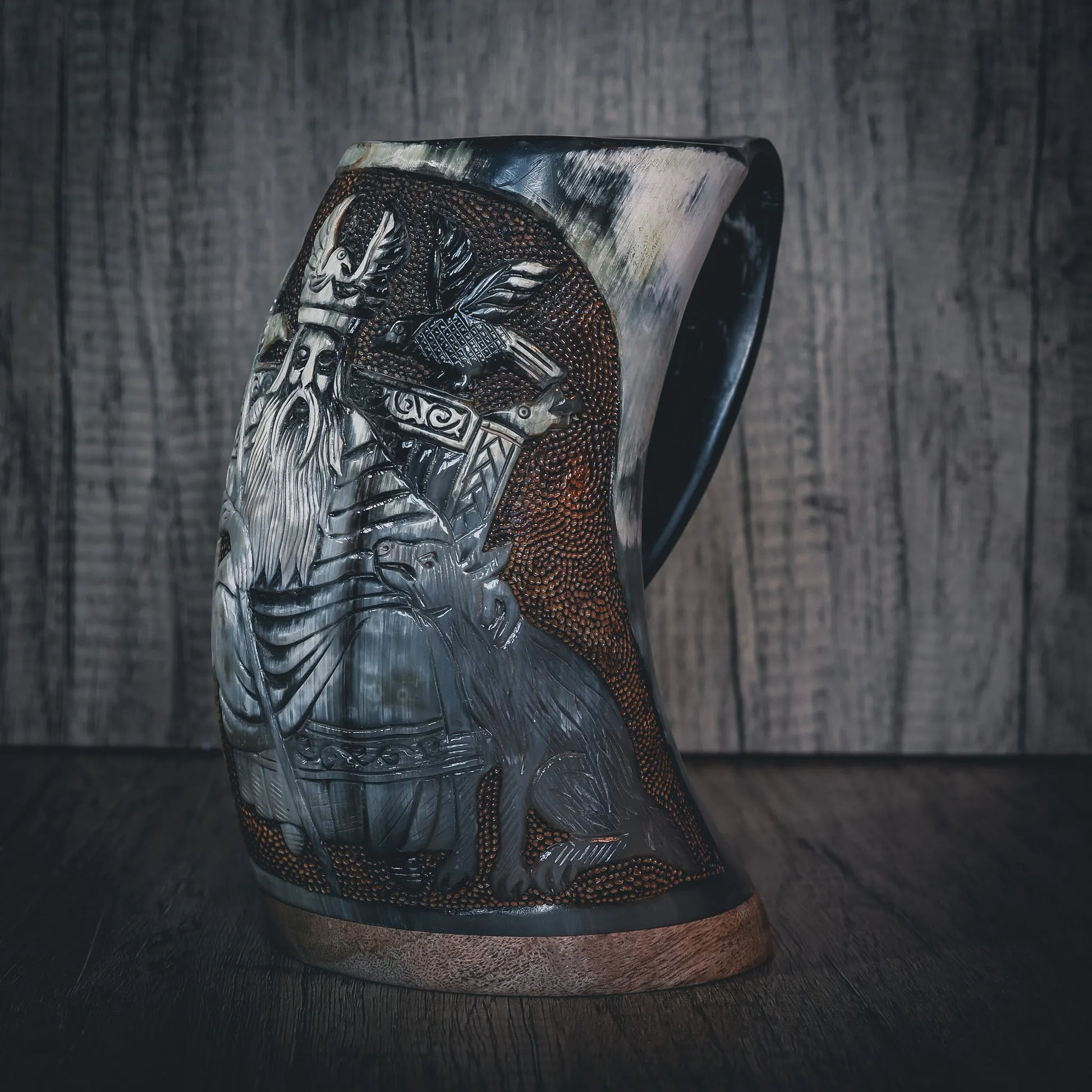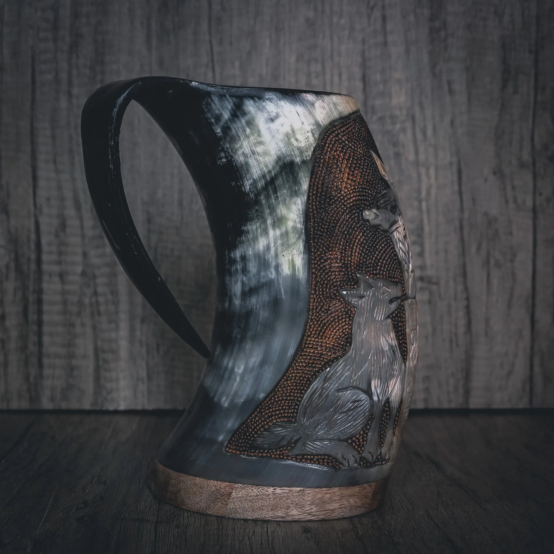 Imponera på vem som helst med detta unika handsnidade hornkrus. För att kunna tillverka dessa enastående konstverk, har våra hantverkare först letat igenom hundratals horn i sin jakt på ett horn som är tjockt nog. För att vara så tjocka i godset som 10mm måste hornen komma från riktiga monster till tjurar. När det rätta hornet hittats, påbörjas den många timmar långa processen med att skära, slipa och polera. Varje horns unika färg och form, i kombination med hantverkarens skicklighet och motivets kraft, skapar ett unikt mästerverk av en kvalitet som sällan ses idag.