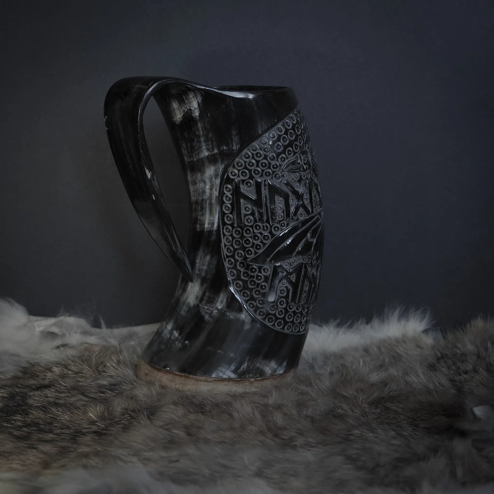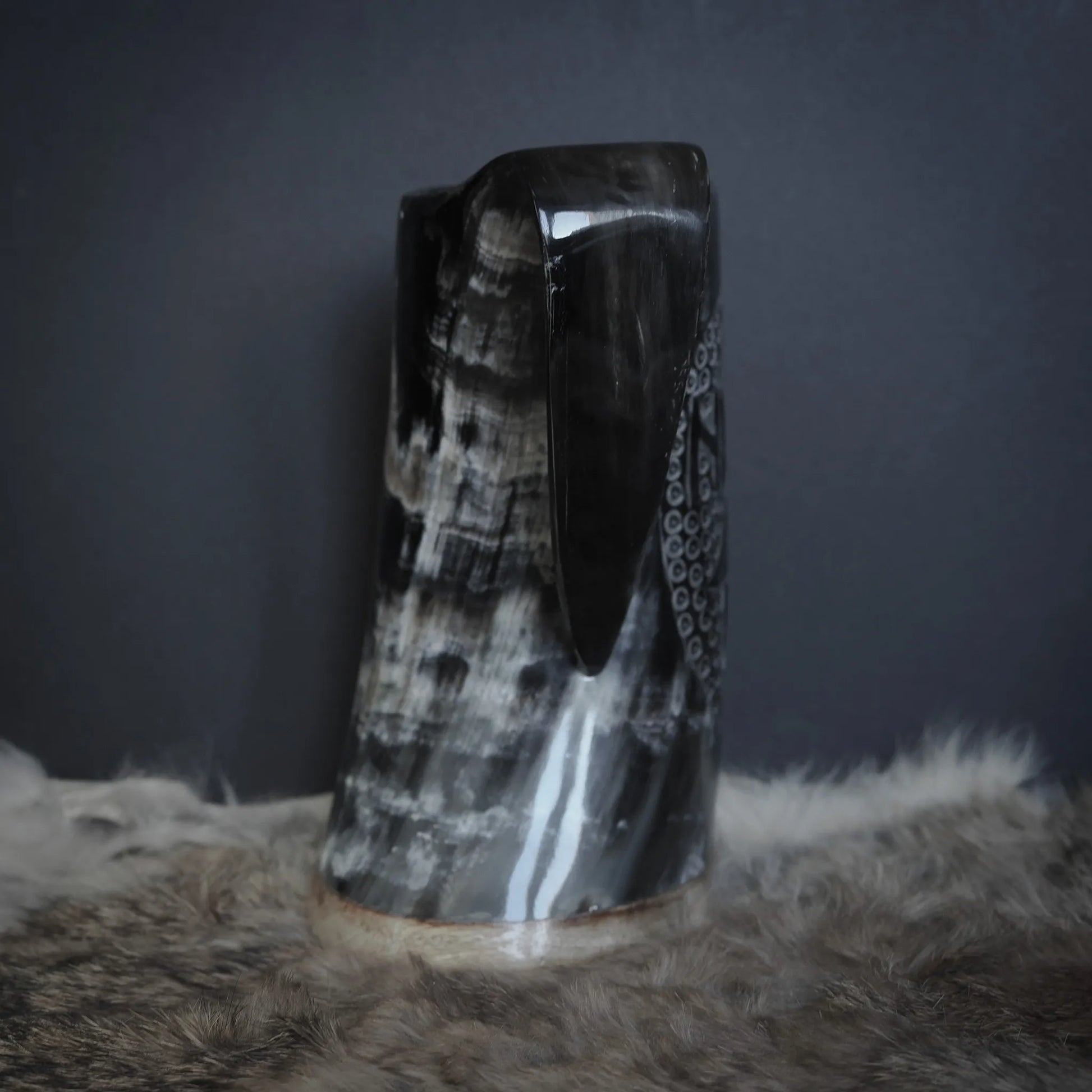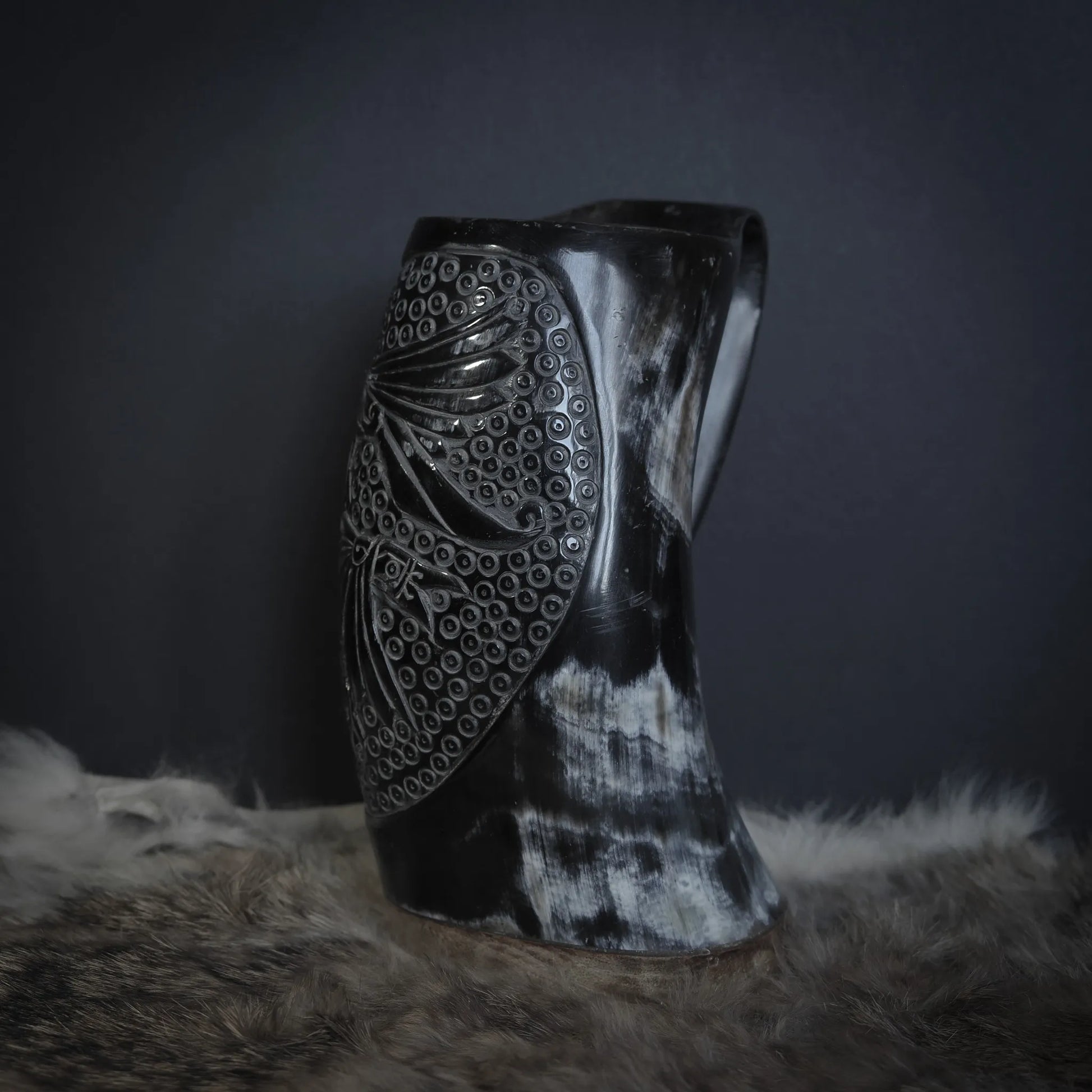 Imponera på vem som helst med detta unika handsnidade hornkrus. För att kunna tillverka dessa enastående konstverk, har våra hantverkare först letat igenom hundratals horn i sin jakt på ett horn som är tjockt nog. För att vara så tjocka i godset som 10mm måste hornen komma från riktiga monster till tjurar. När det rätta hornet hittats, påbörjas den många timmar långa processen med att skära, slipa och polera. Varje horns unika färg och form, i kombination med hantverkarens skicklighet och motivets kraft, skapar ett unikt mästerverk av en kvalitet som sällan ses idag.