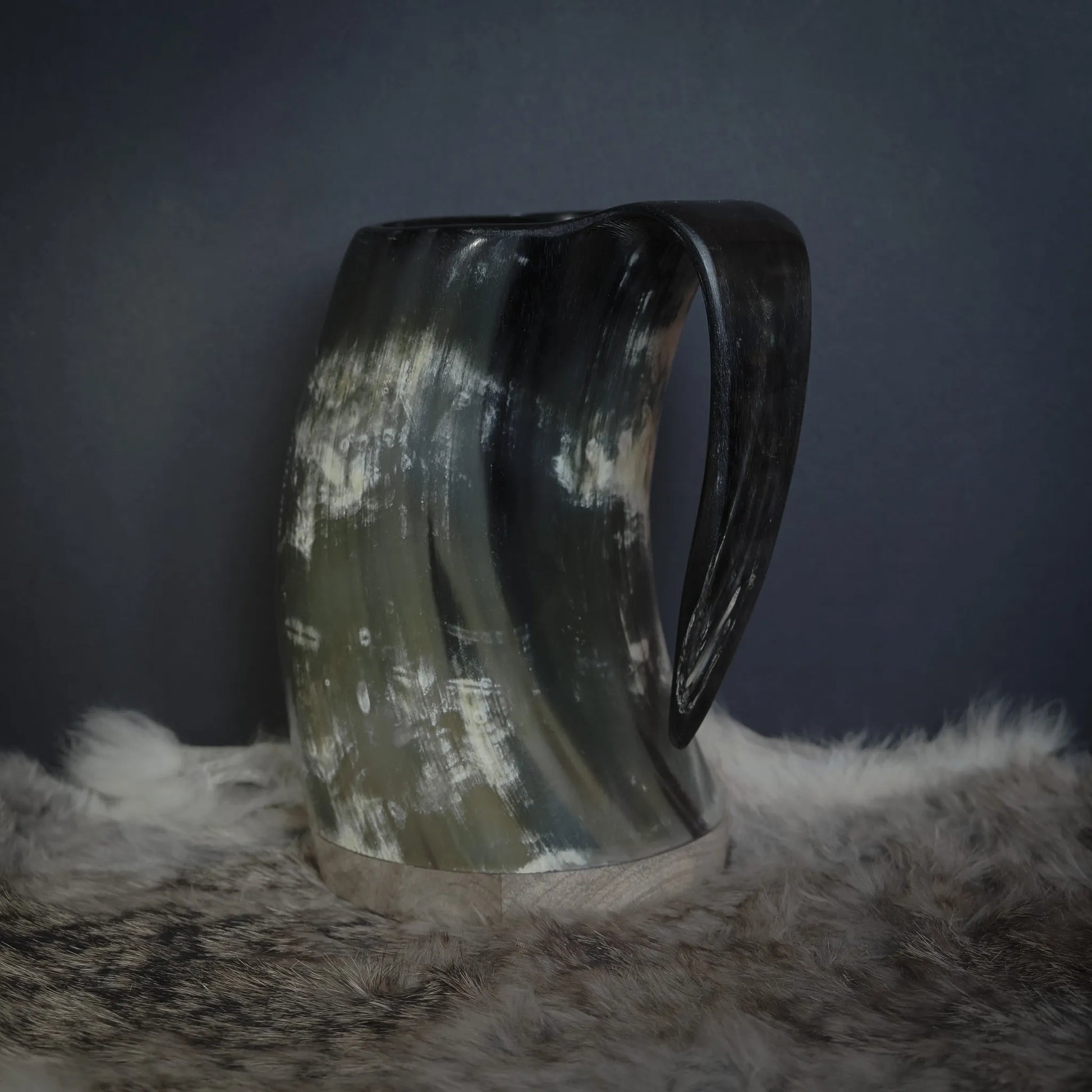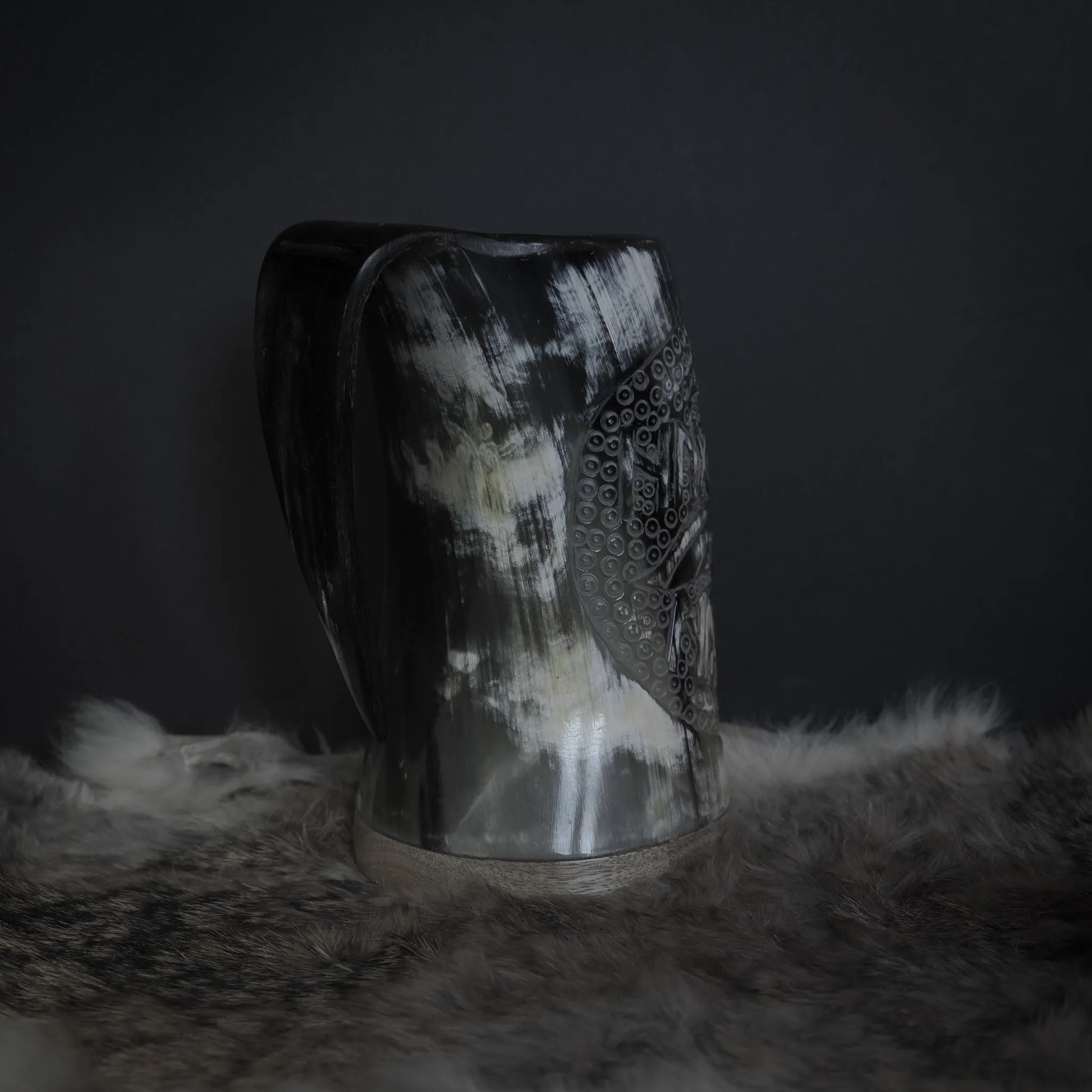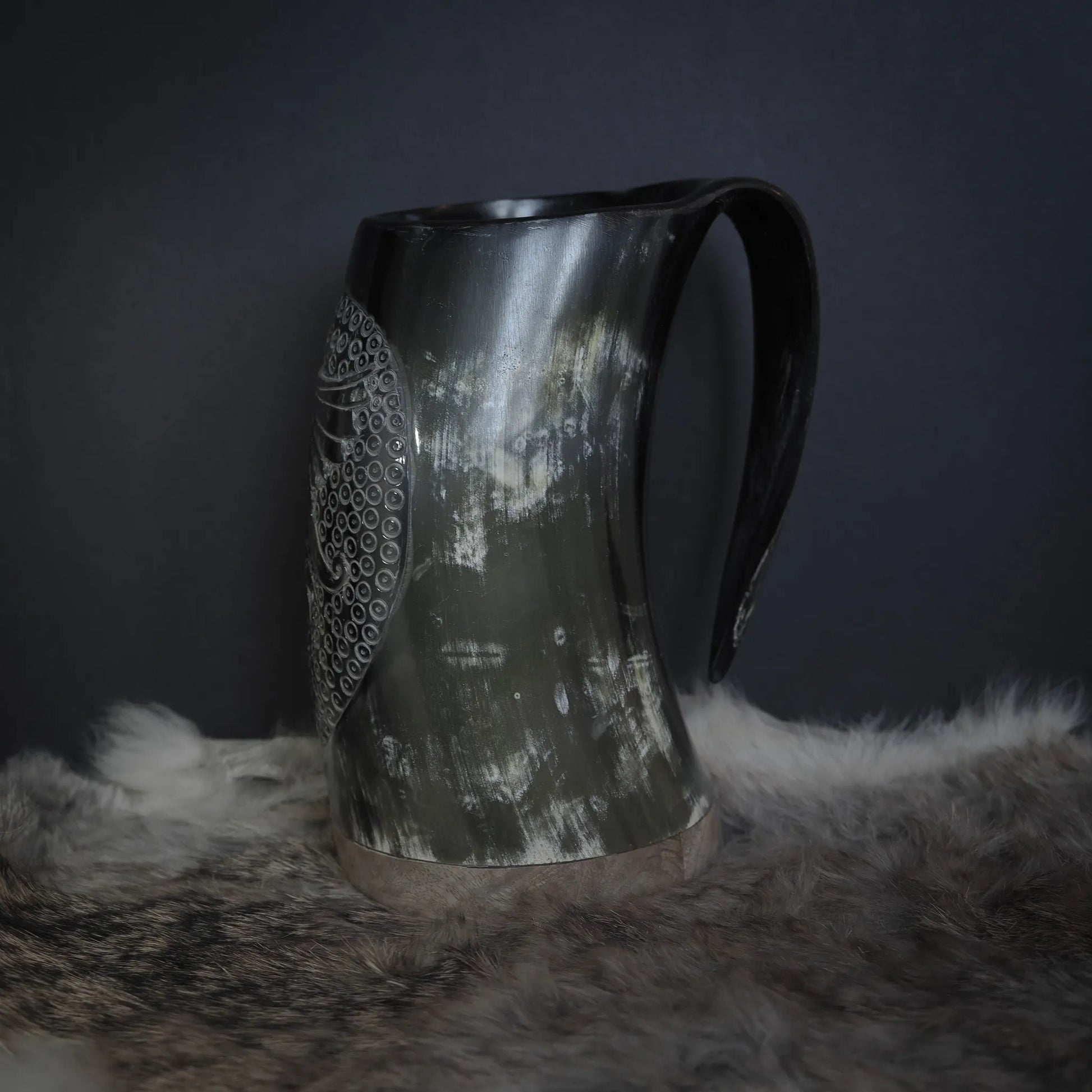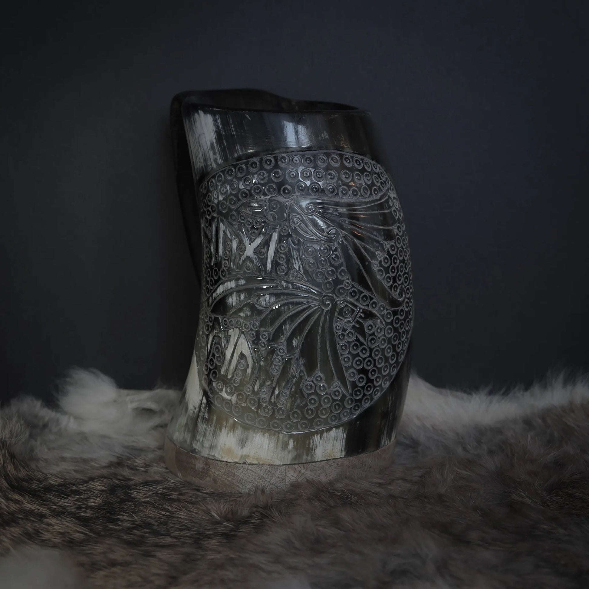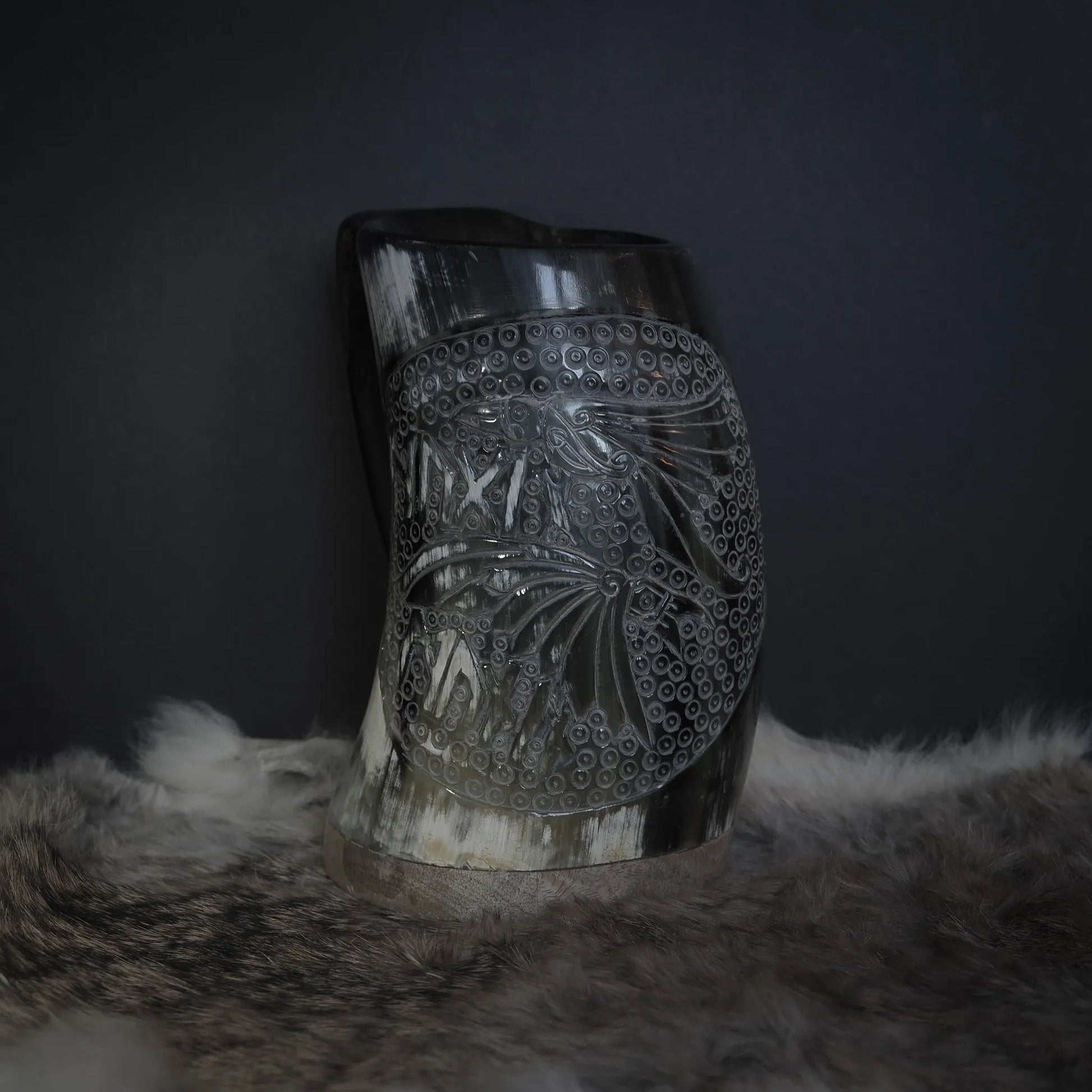 Imponera på vem som helst med detta unika handsnidade hornkrus. För att kunna tillverka dessa enastående konstverk, har våra hantverkare först letat igenom hundratals horn i sin jakt på ett horn som är tjockt nog. För att vara så tjocka i godset som 10mm måste hornen komma från riktiga monster till tjurar. När det rätta hornet hittats, påbörjas den många timmar långa processen med att skära, slipa och polera. Varje horns unika färg och form, i kombination med hantverkarens skicklighet och motivets kraft, skapar ett unikt mästerverk av en kvalitet som sällan ses idag.