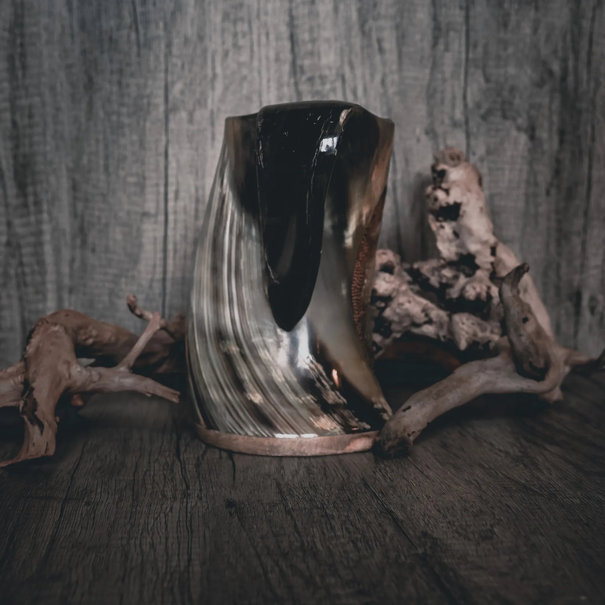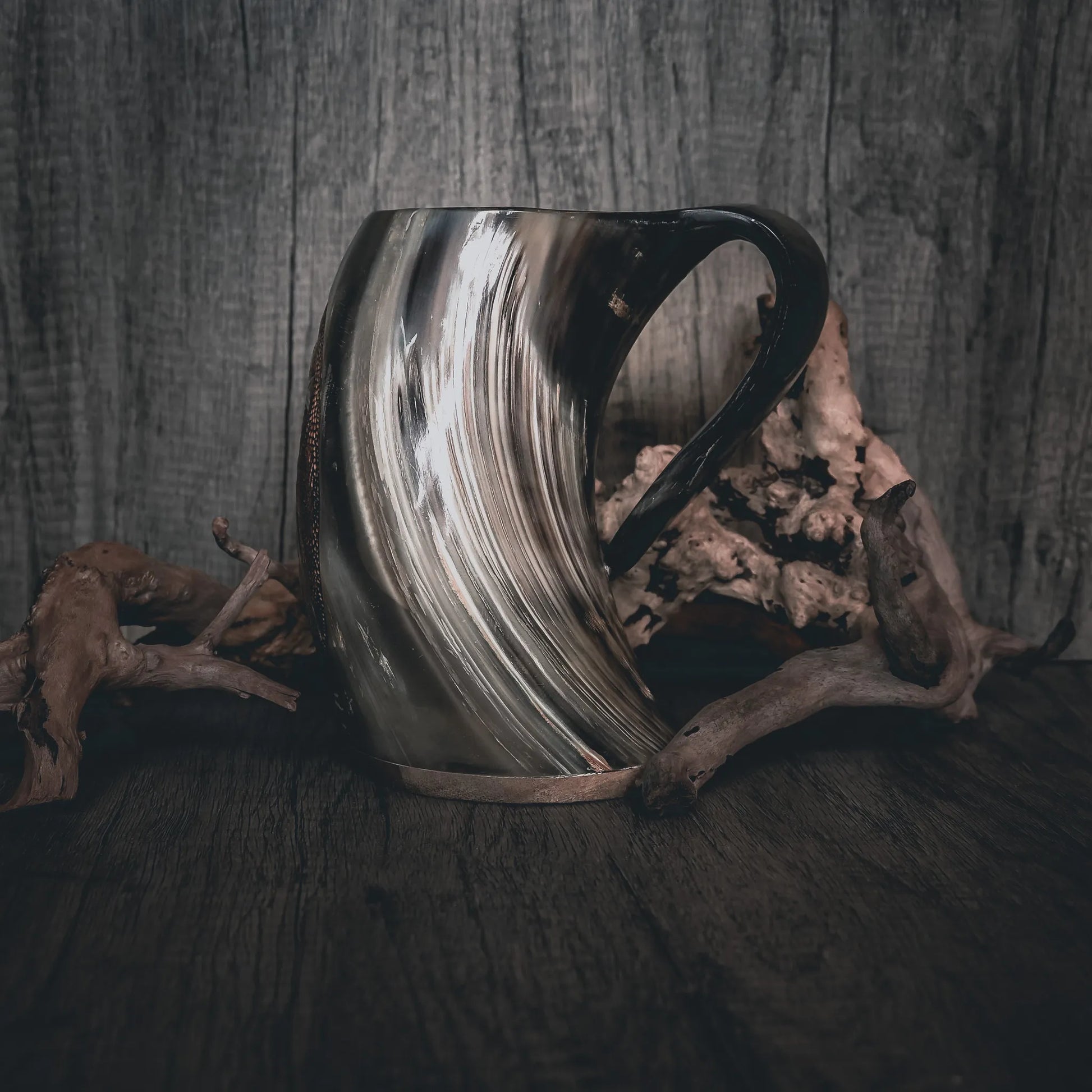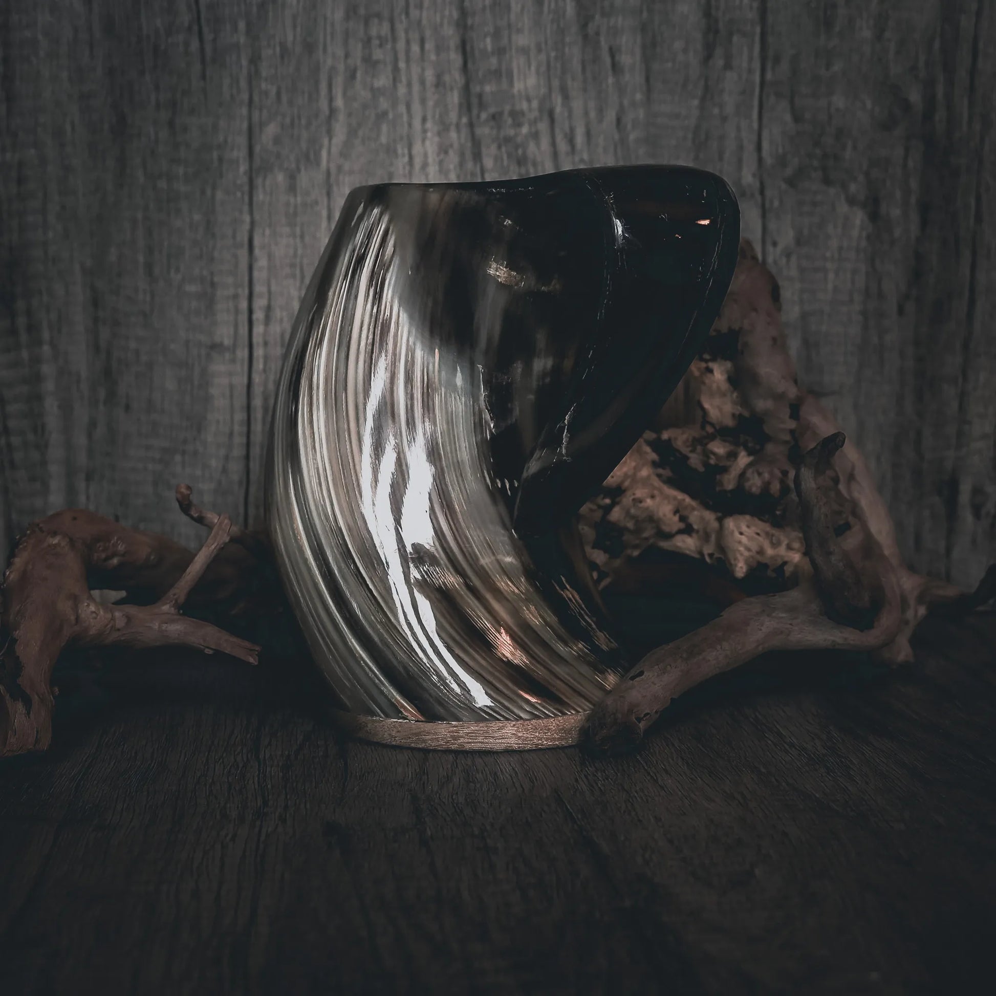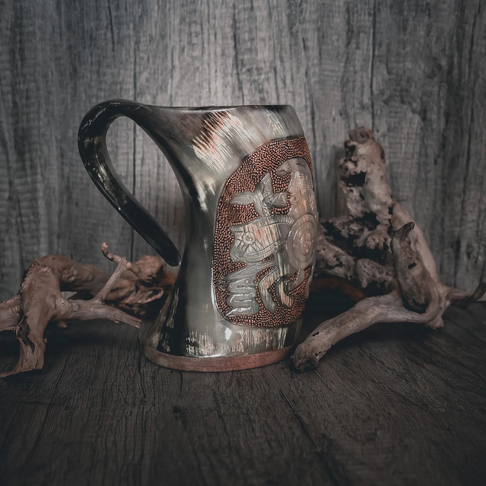 Imponera på vem som helst med detta unika handsnidade hornkrus. För att kunna tillverka dessa enastående konstverk, har våra hantverkare först letat igenom hundratals horn i sin jakt på ett horn som är tjockt nog. För att vara så tjocka i godset som 10mm måste hornen komma från riktiga monster till tjurar. När det rätta hornet hittats, påbörjas den många timmar långa processen med att skära, slipa och polera. Varje horns unika färg och form, i kombination med hantverkarens skicklighet och motivets kraft, skapar ett unikt mästerverk av en kvalitet som sällan ses idag.