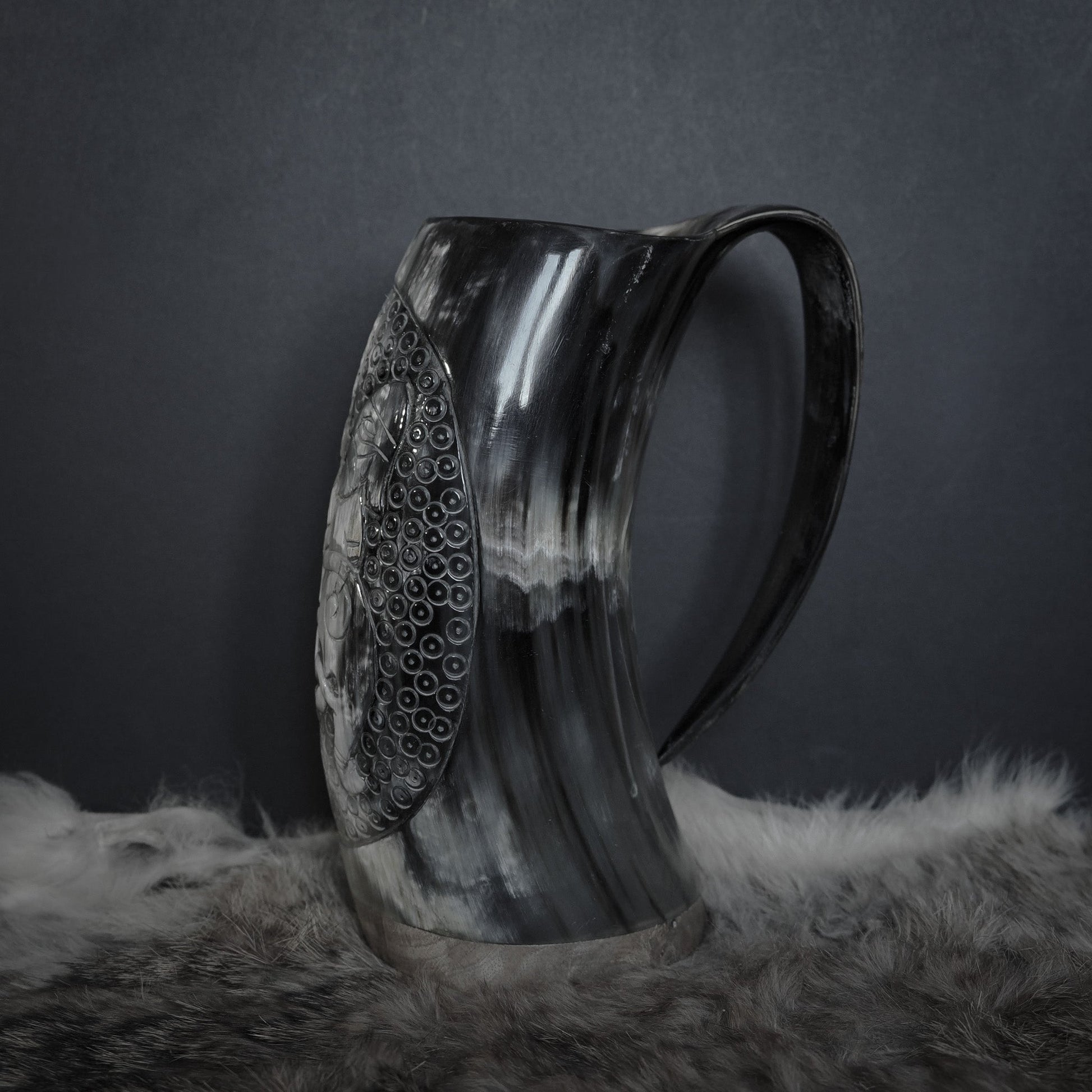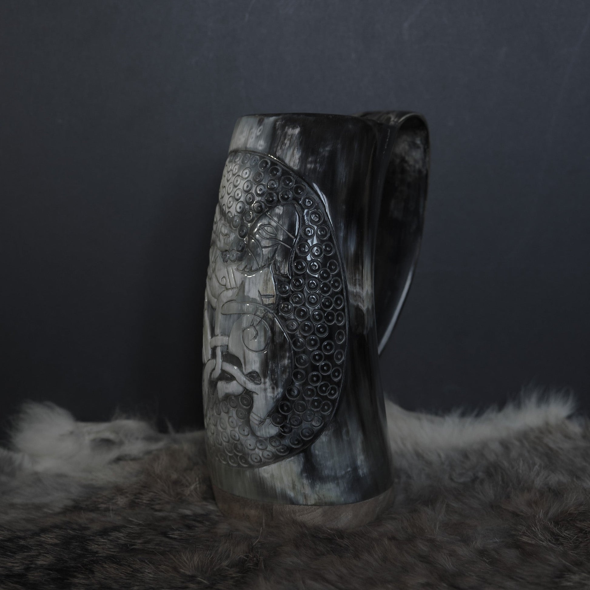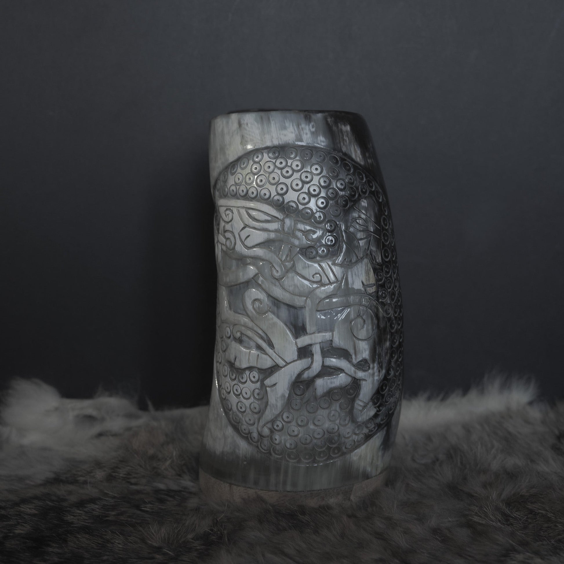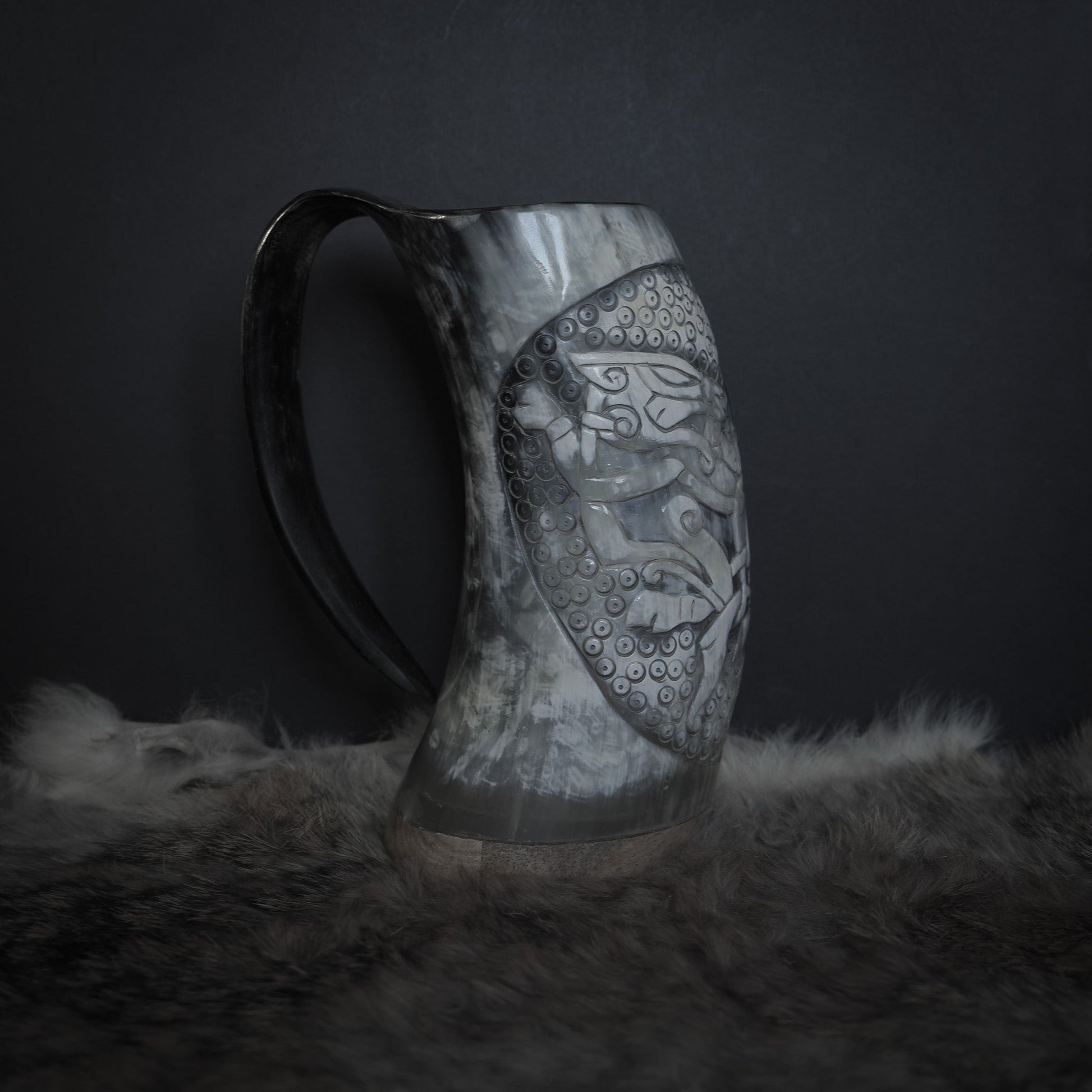 Imponera på vem som helst med detta unika handsnidade hornkrus. För att kunna tillverka dessa enastående konstverk, har våra hantverkare först letat igenom hundratals horn i sin jakt på ett horn som är tjockt nog. För att vara så tjocka i godset som 10mm måste hornen komma från riktiga monster till tjurar. När det rätta hornet hittats, påbörjas den många timmar långa processen med att skära, slipa och polera. Varje horns unika färg och form, i kombination med hantverkarens skicklighet och motivets kraft, skapar ett unikt mästerverk av en kvalitet som sällan ses idag.