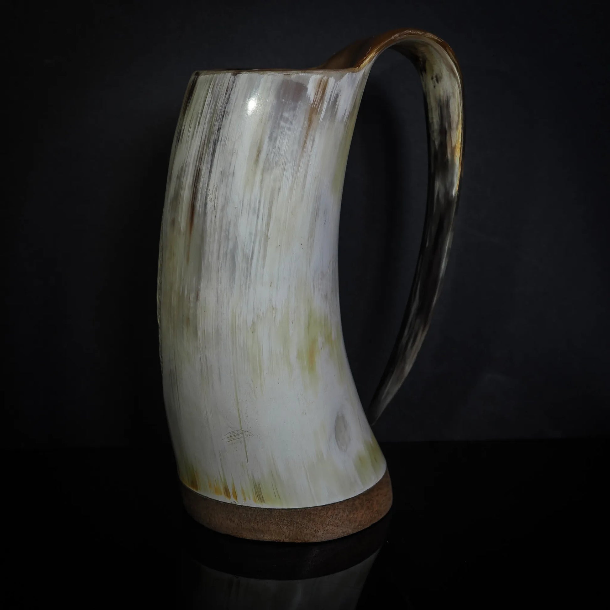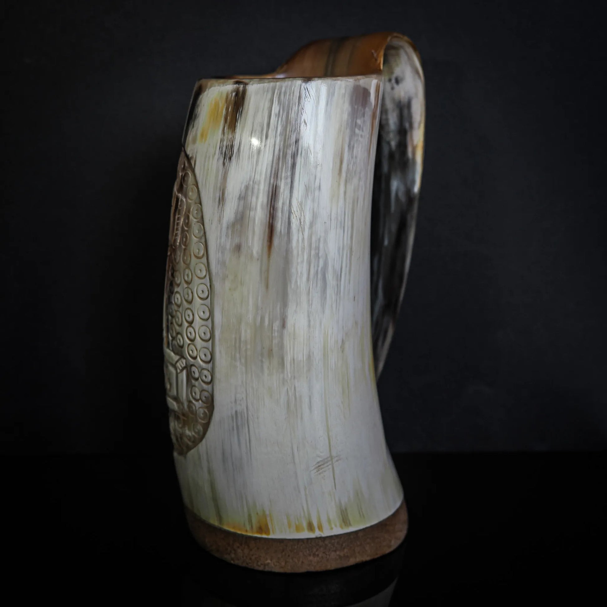 Imponera på vem som helst med detta unika handsnidade hornkrus. För att kunna tillverka dessa enastående konstverk, har våra hantverkare först letat igenom hundratals horn i sin jakt på ett horn som är tjockt nog. För att vara så tjocka i godset som 10mm måste hornen komma från riktiga monster till tjurar. När det rätta hornet hittats, påbörjas den många timmar långa processen med att skära, slipa och polera. Varje horns unika färg och form, i kombination med hantverkarens skicklighet och motivets kraft, skapar ett unikt mästerverk av en kvalitet som sällan ses idag.