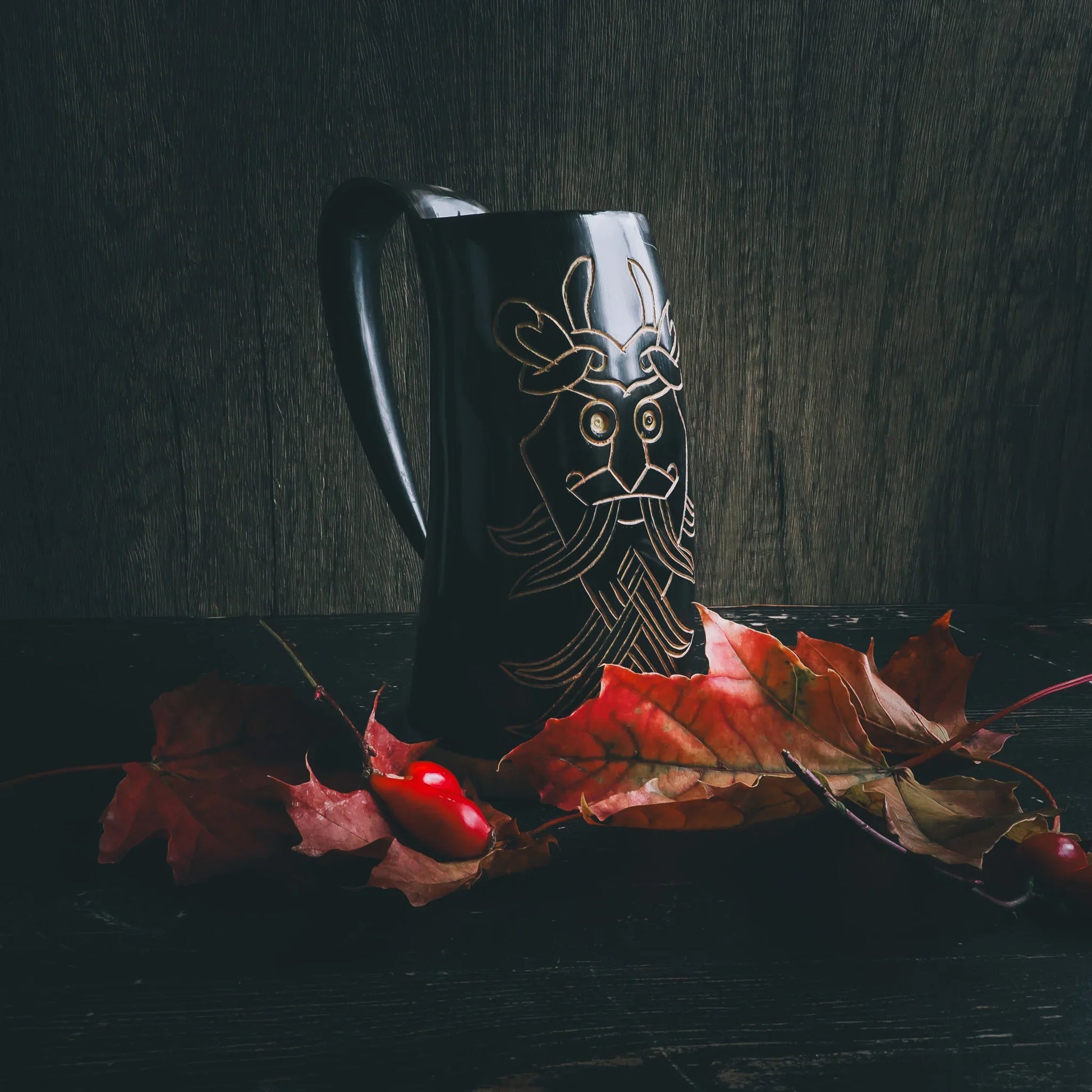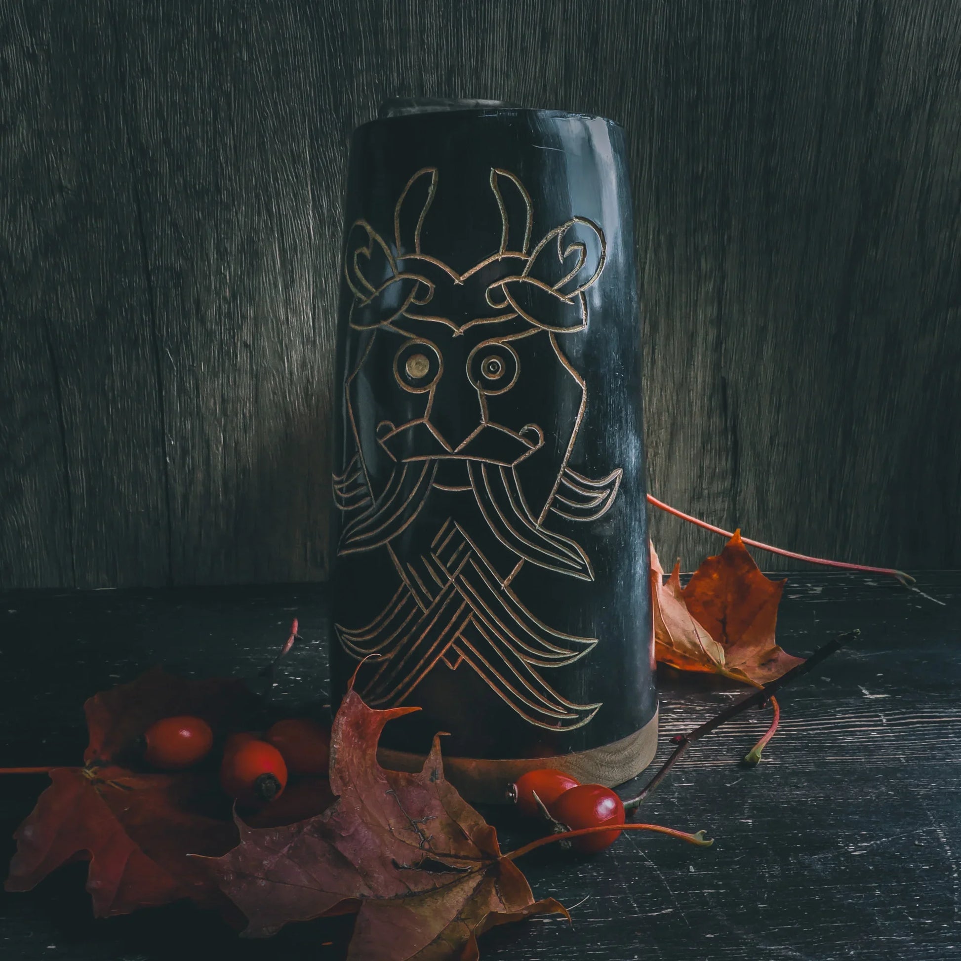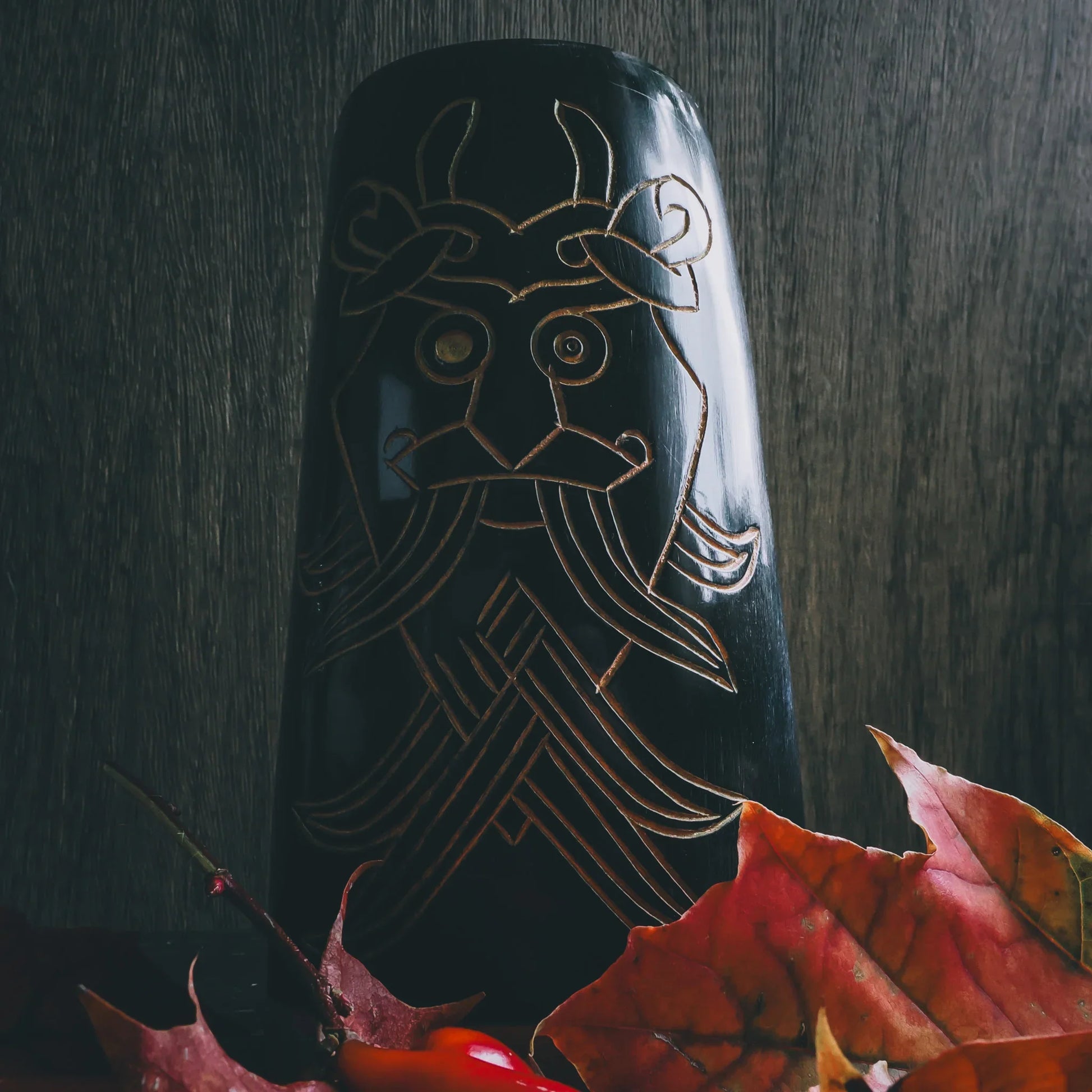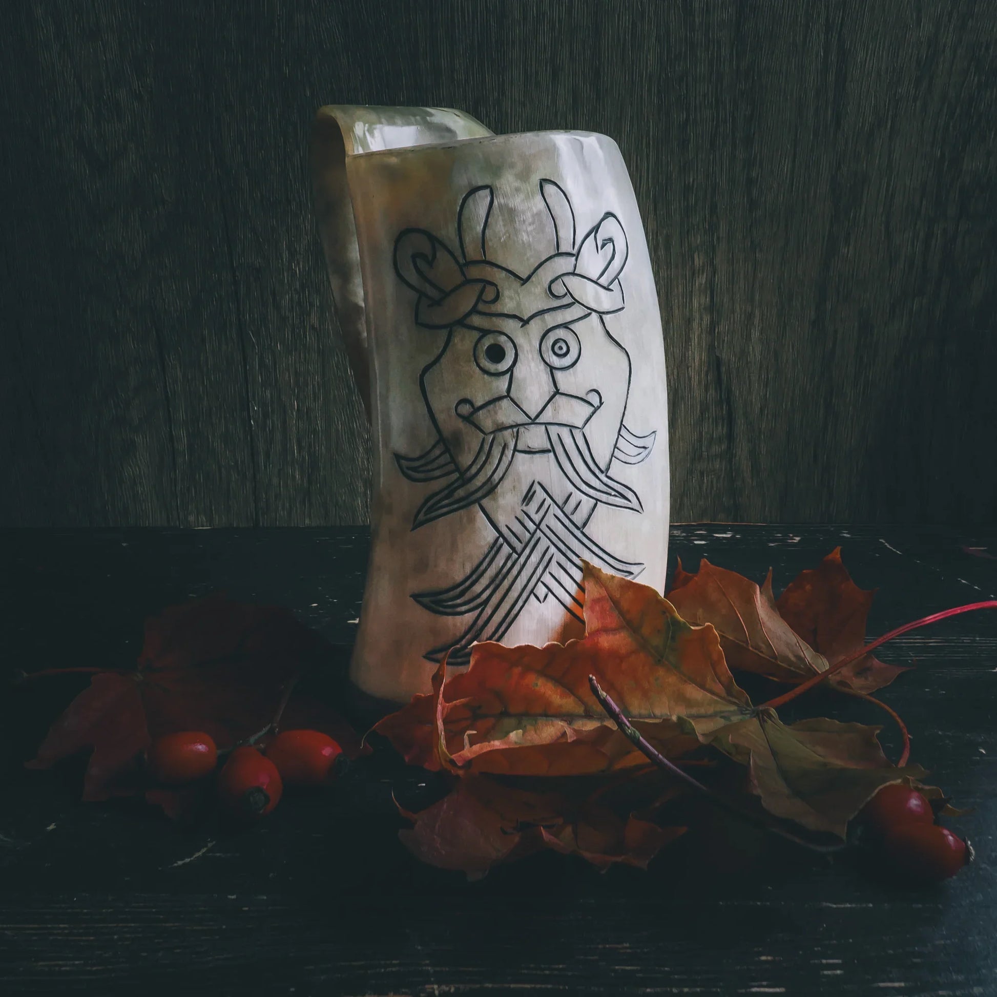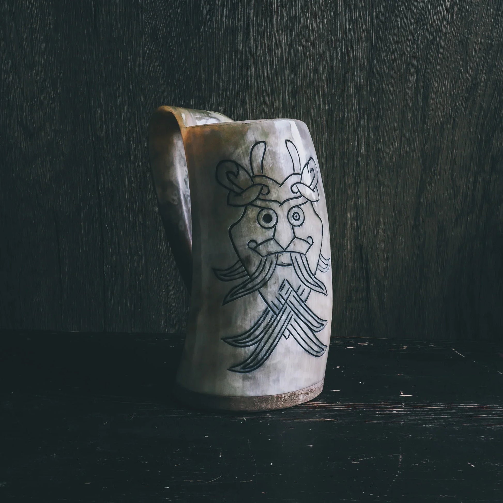 Ett äkta handsnidat ölkrus med en typisk vikingatida mask ingraverad. Masken kommer från en runsten i Danmark och föreställer Oden.