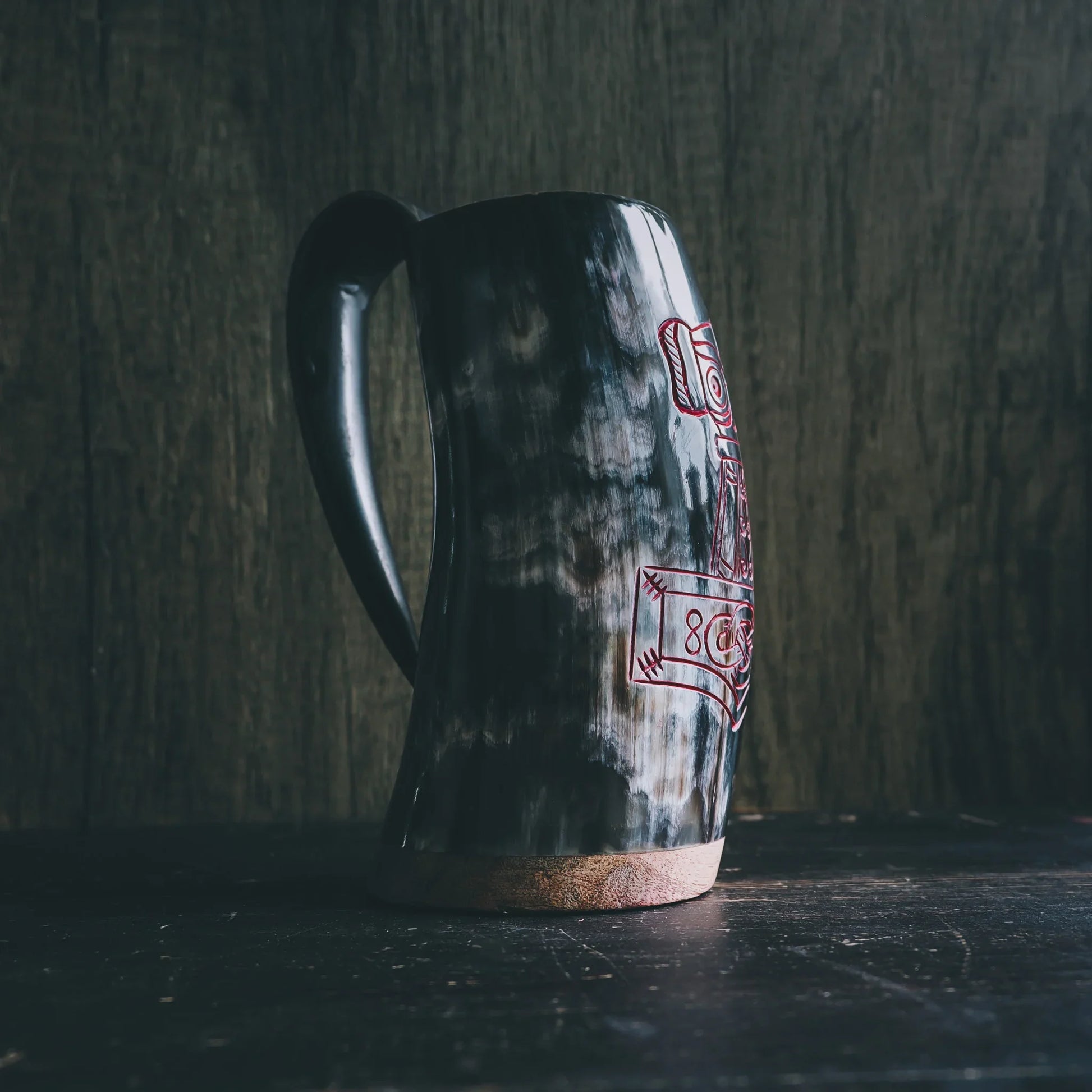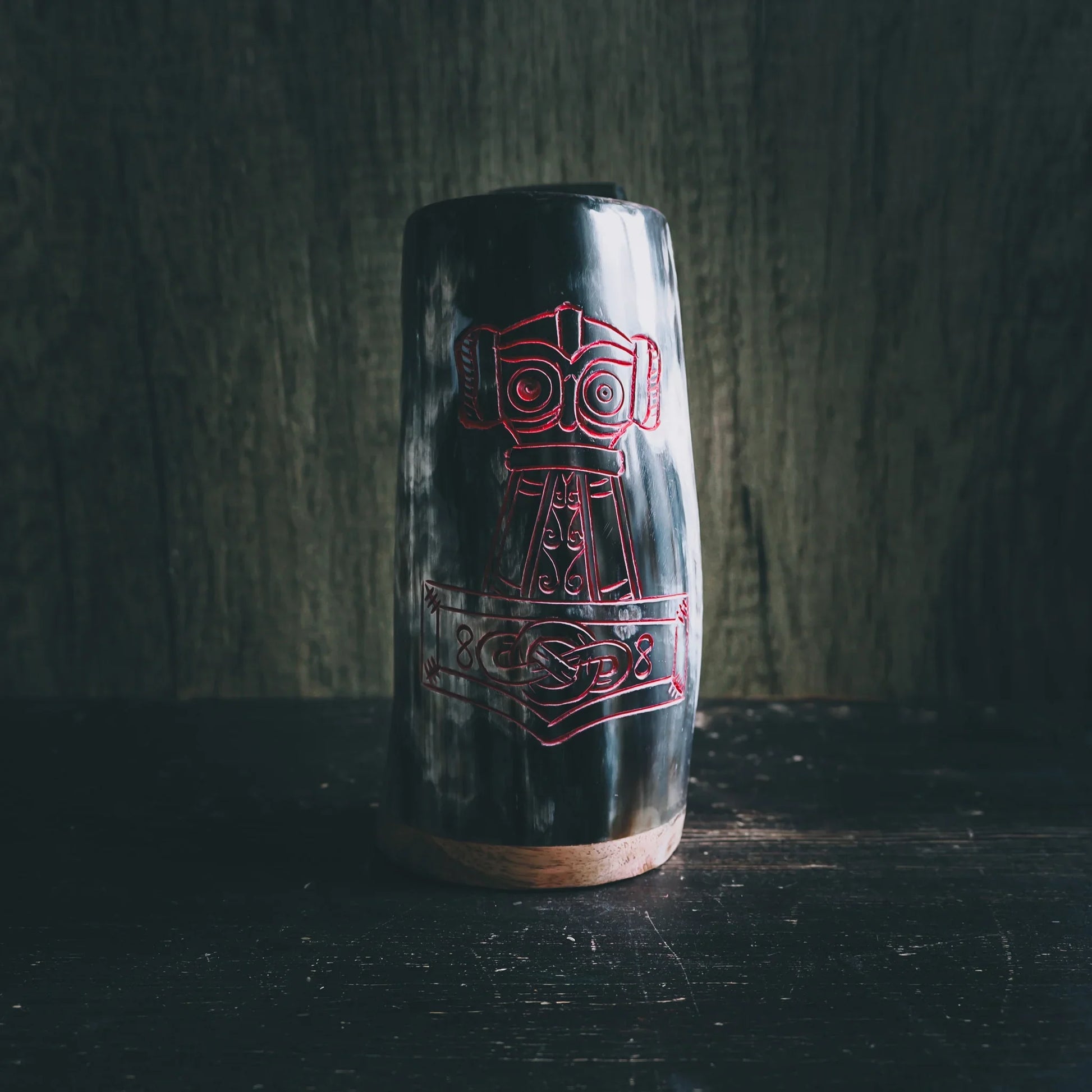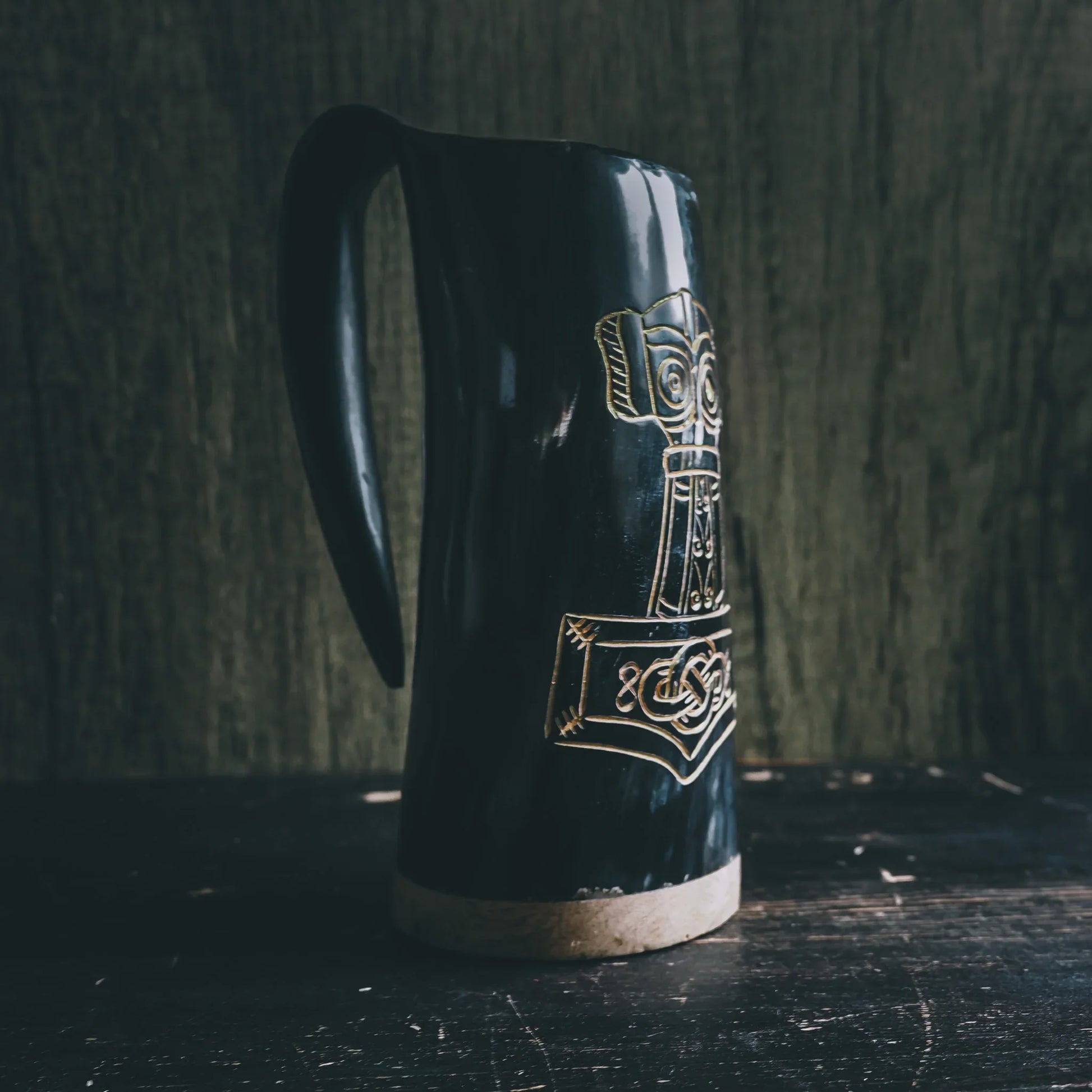 Ett äkta handsnidat ölkrus med en snyggt graverad Torshammare. Skåla ordentligt på vikingavis i goda vänners lag. Det praktiska handtaget gör också kruset lätt att hänga i bältet. Modellen är väldigt stryktålig men passar sig inte för uppvärmda drycker. Insidan är polerad och lackerad.