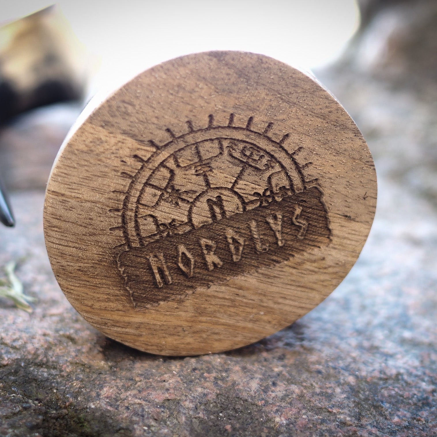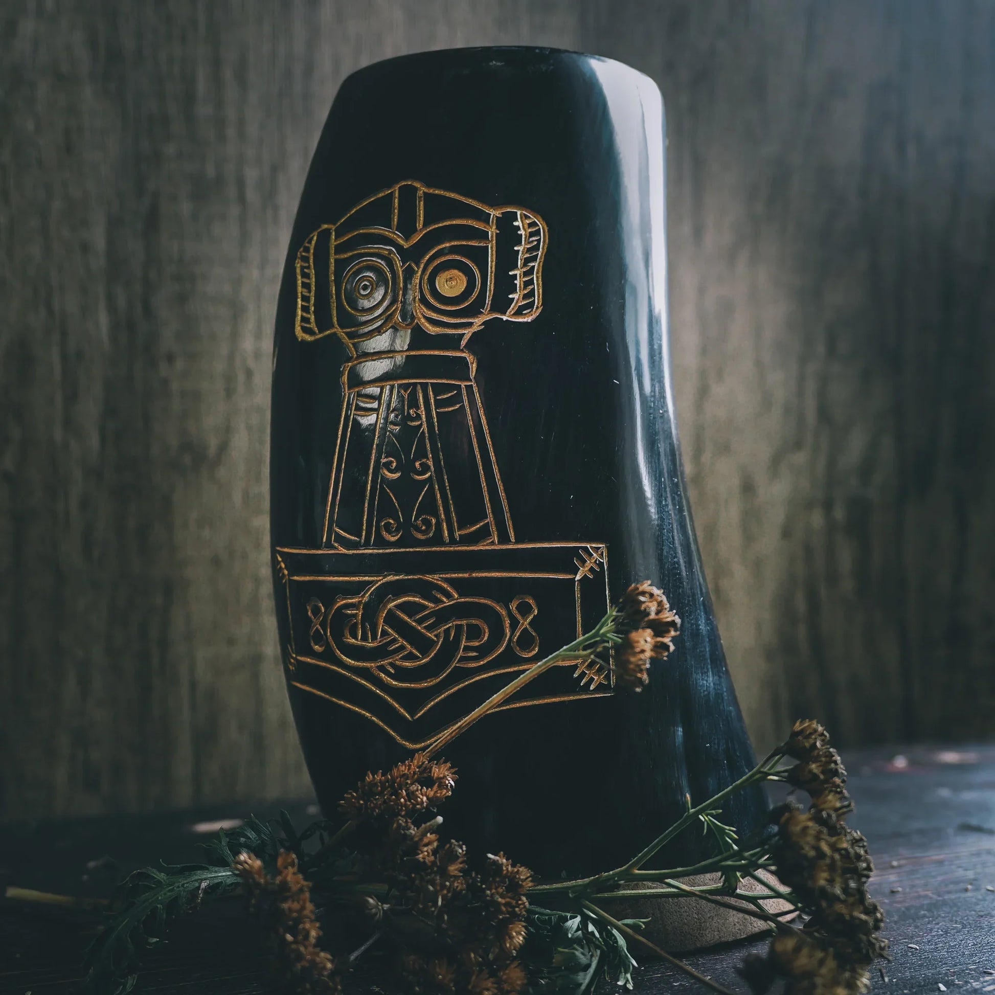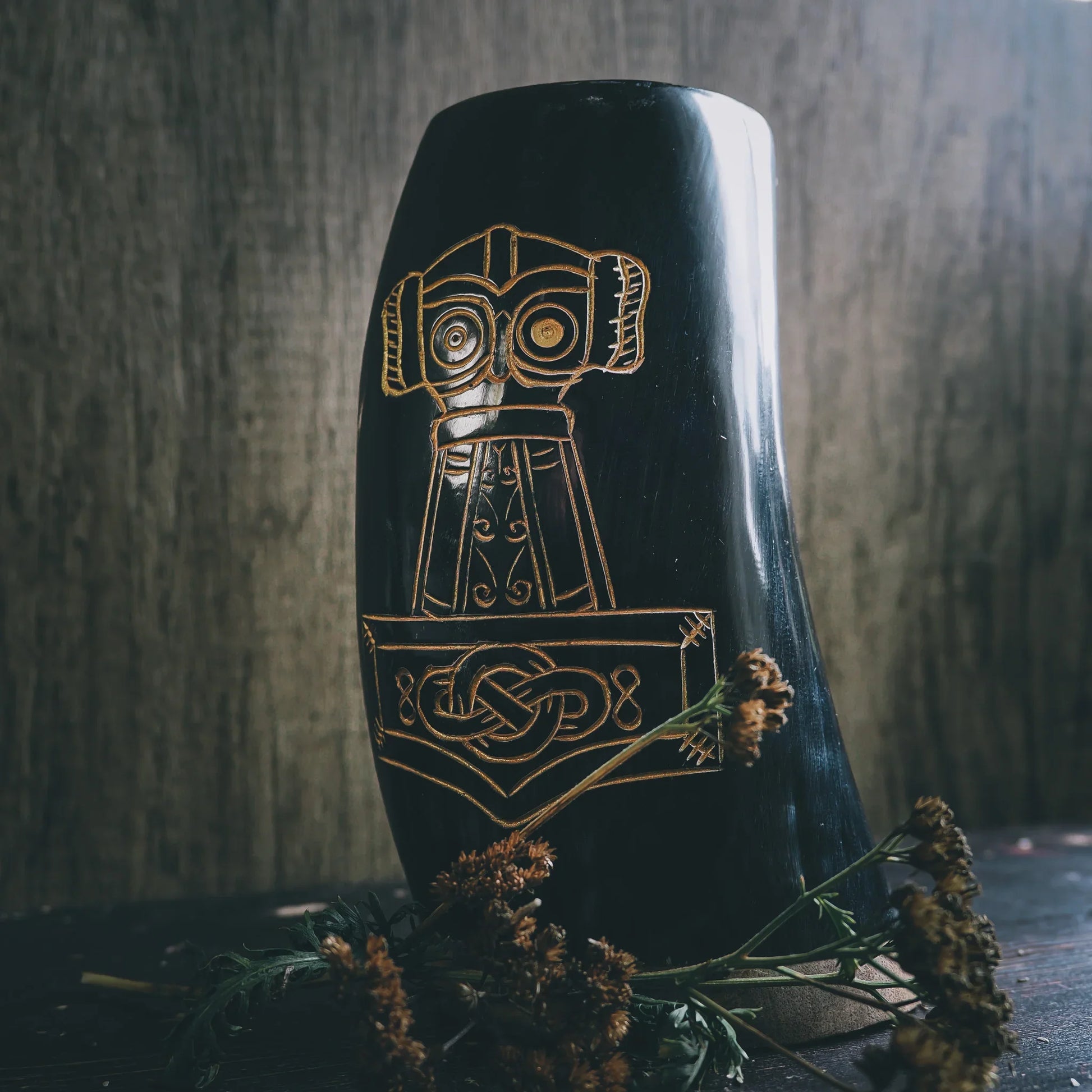 Ett äkta handsnidat ölkrus med en snyggt graverad Torshammare. Skåla ordentligt på vikingavis i goda vänners lag. Det praktiska handtaget gör också kruset lätt att hänga i bältet. Modellen är väldigt stryktålig men passar sig inte för uppvärmda drycker. Insidan är polerad och lackerad.