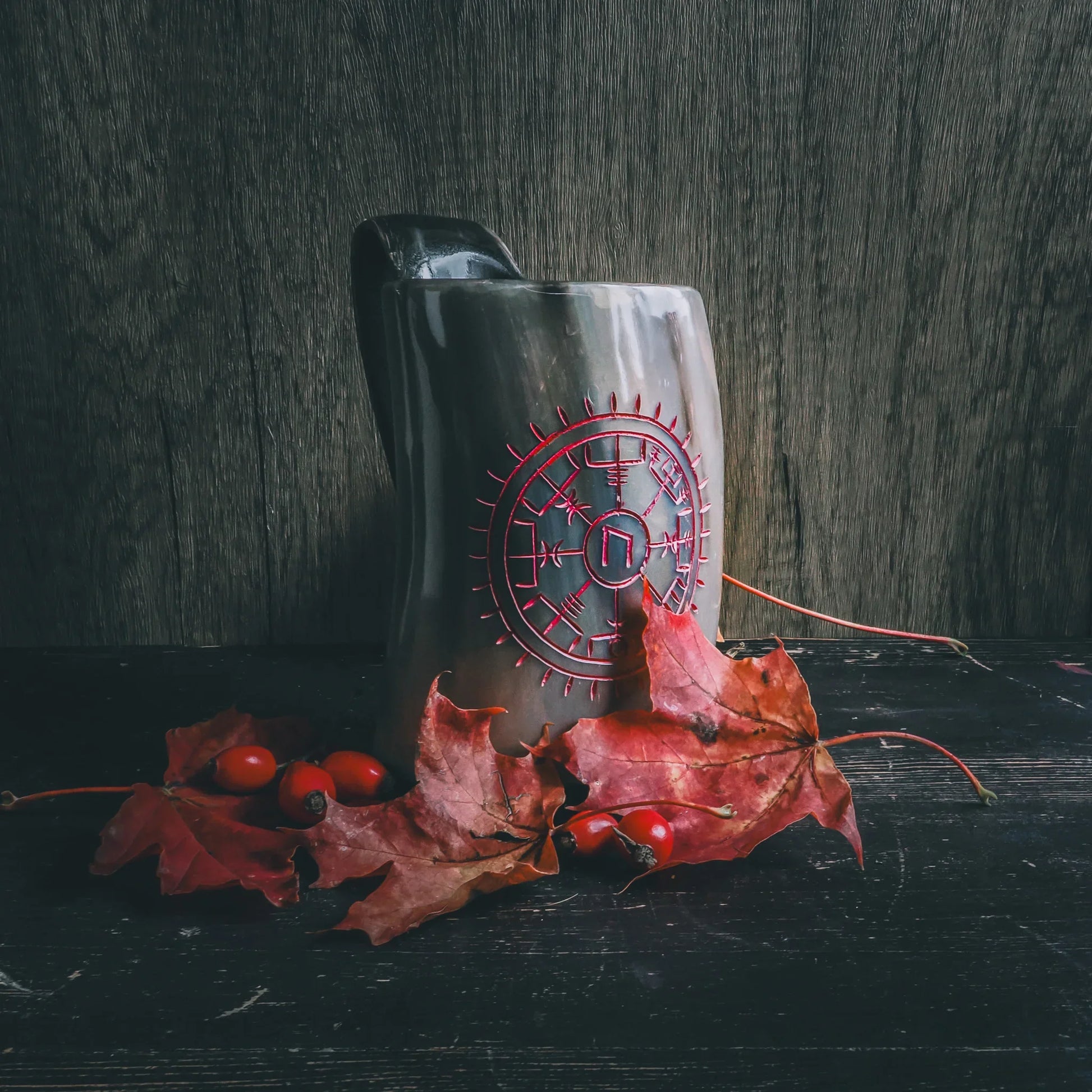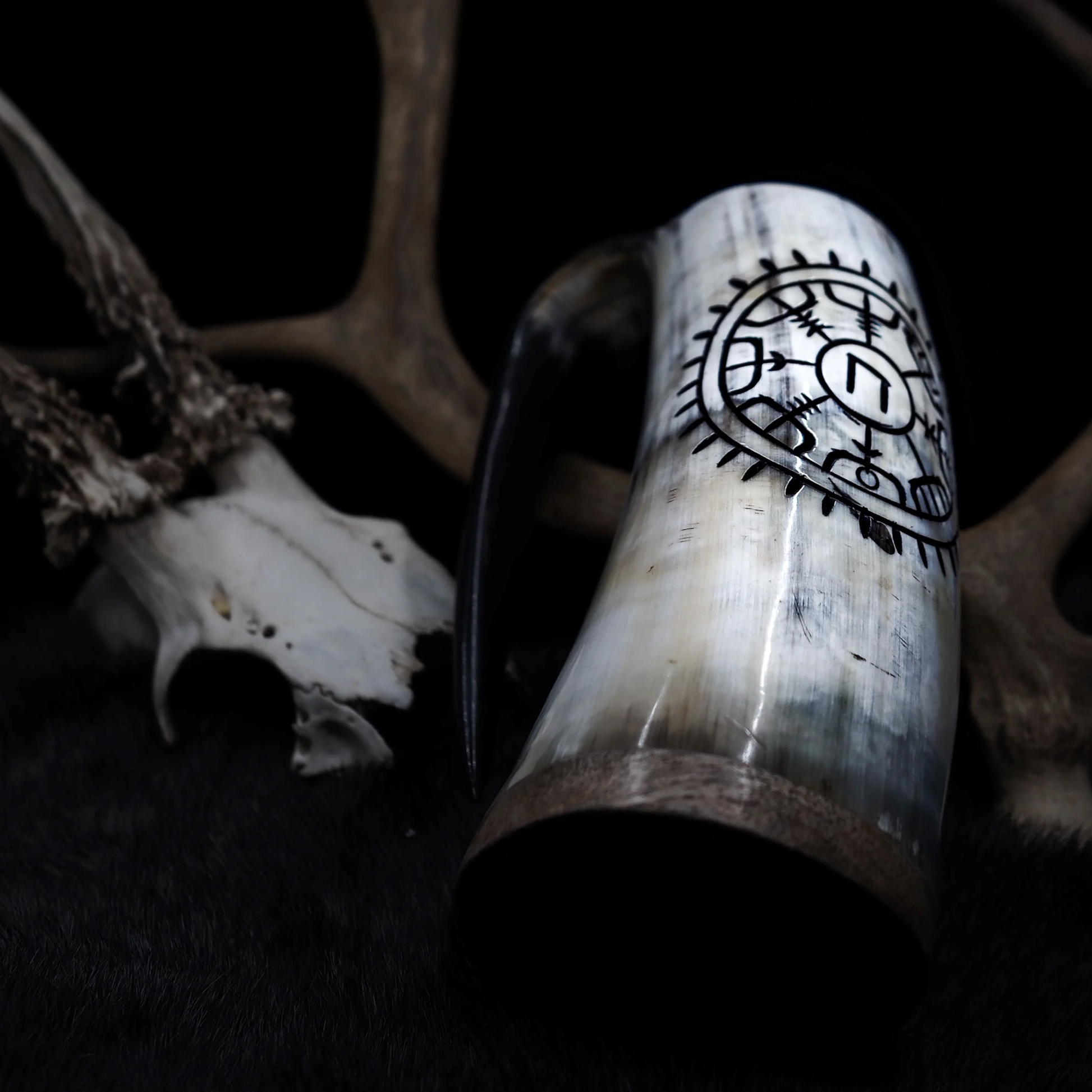 Ett äkta handsnidat ölkrus med en graverad bindruna med Ur runan i mitten. Skåla ordentligt på vikingavis, i goda vänners lag. Det praktiska handtaget gör också kruset lätt att hänga i bältet. Modellen är väldigt stryktålig men passar sig inte för uppvärmda drycker. Insidan är polerad och lackerad. Graveringen är inspirerad av en isländsk bindruna som hittats i ett manuskript från 1800-talet. Bindrunan ska leda dig rätt på livets färd. I mitten har vi placerat en vikingatida Ur runa som förstärker magin.