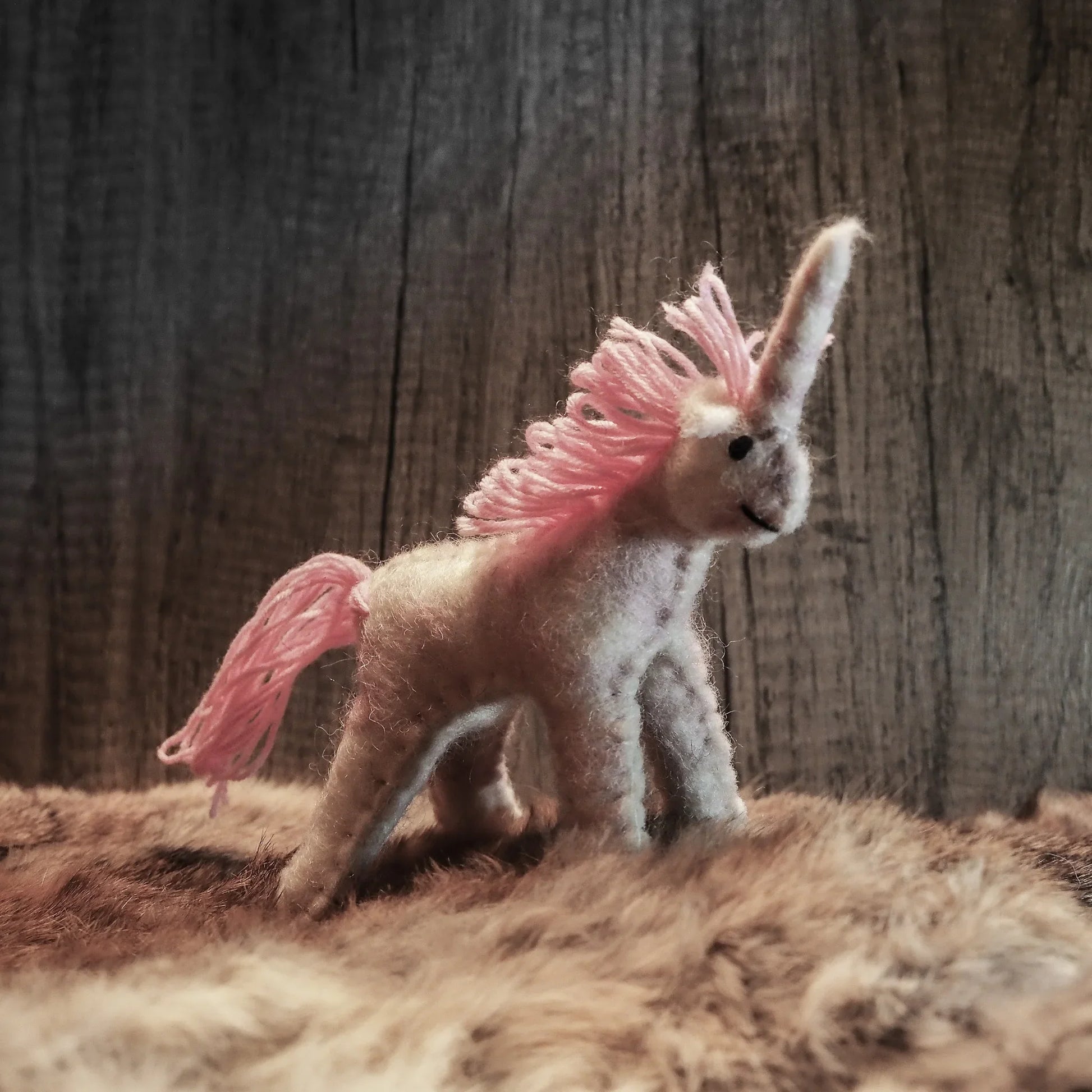 Tovad enhörning, rosa och vit i 100% ull. Det finns historiska belägg som tyder på att vikingarna uppfann konceptet med enhörningar. Kanske för att sälja narvalständer med mytologiskt ursprung. Den äldsta kända bilden av en enhörning är från ett dryckeshorn som hittats i Irland.