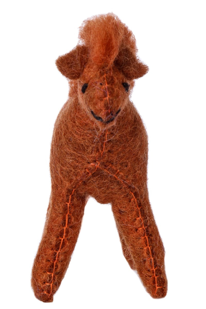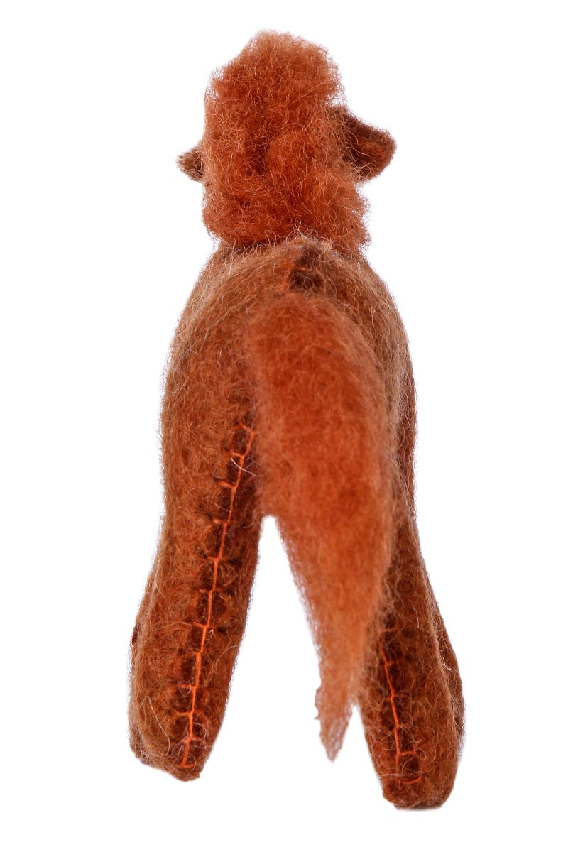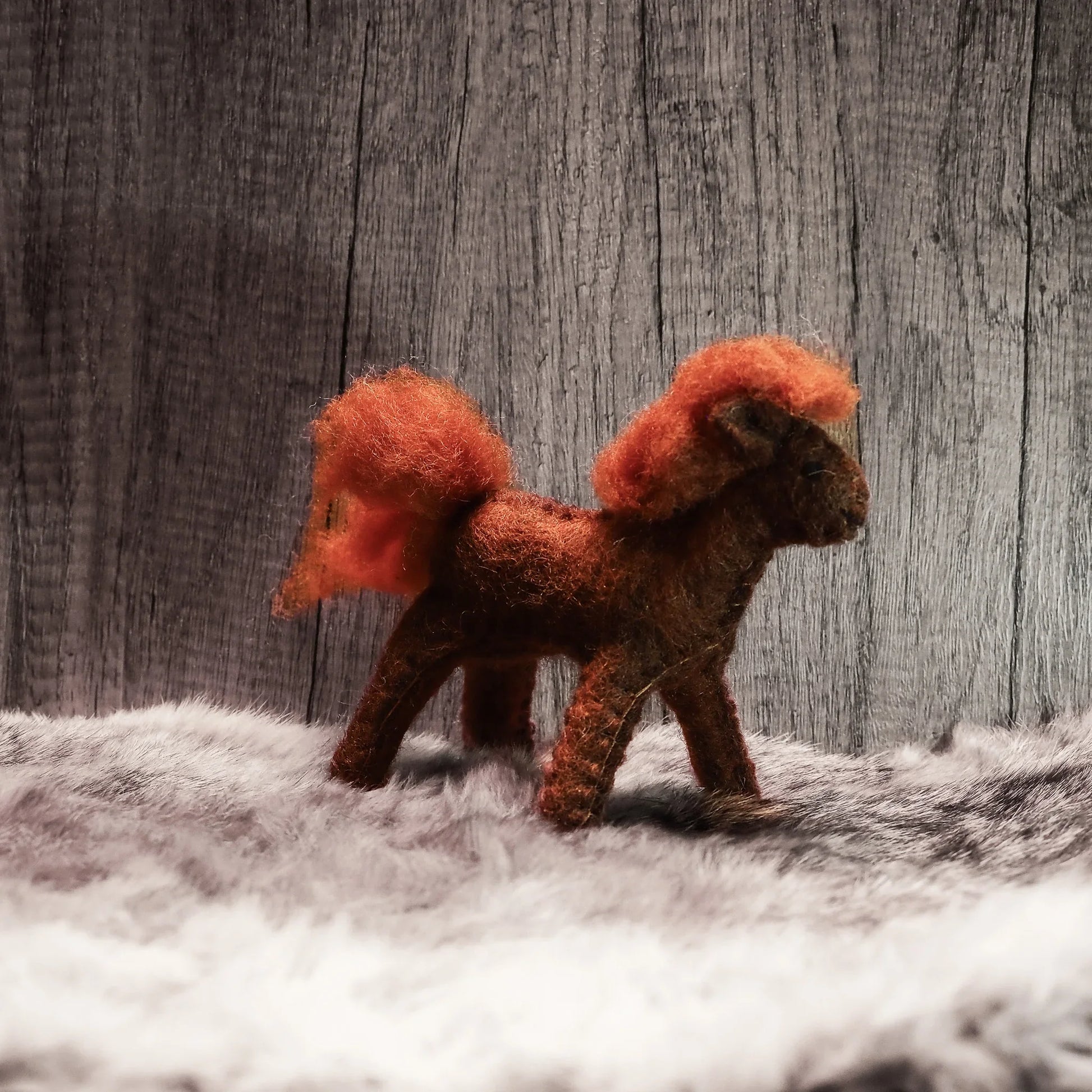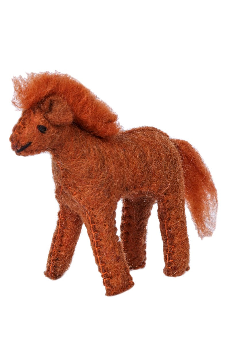 Tovad fux färgad häst i ull. Alla våra tovade djur är fria från plastmaterial och färgade med vattenbaserad giftfri färg. Tovningen görs helt utan skadliga kemikalier. Det är bara varmt vatten och såpa som tillsätts. Även stoppningen är 100% ull.