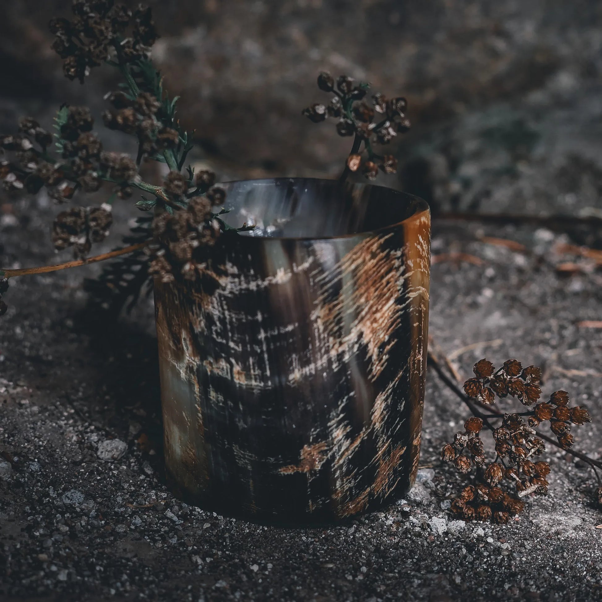 Ett vackert whiskyglas i horn. Glasens fina proportioner och naturliga färgskiftningar gör dem till ett blickfång i vilket sammanhang som helst. Känslan av horn är ett varmt, naturligt intryck med en mjuk känsla när man dricker. Hornets naturliga egenskaper gör det även isolerande, vilket hjälper till att hålla temperaturen på din dryck jämn. Glaset är något brett i förhållande till höjd, vilket varit populärt till whisky de senaste åren. Botten består av trä och är omsorgsfullt anpassat till hornet och pressat på plats med värme.